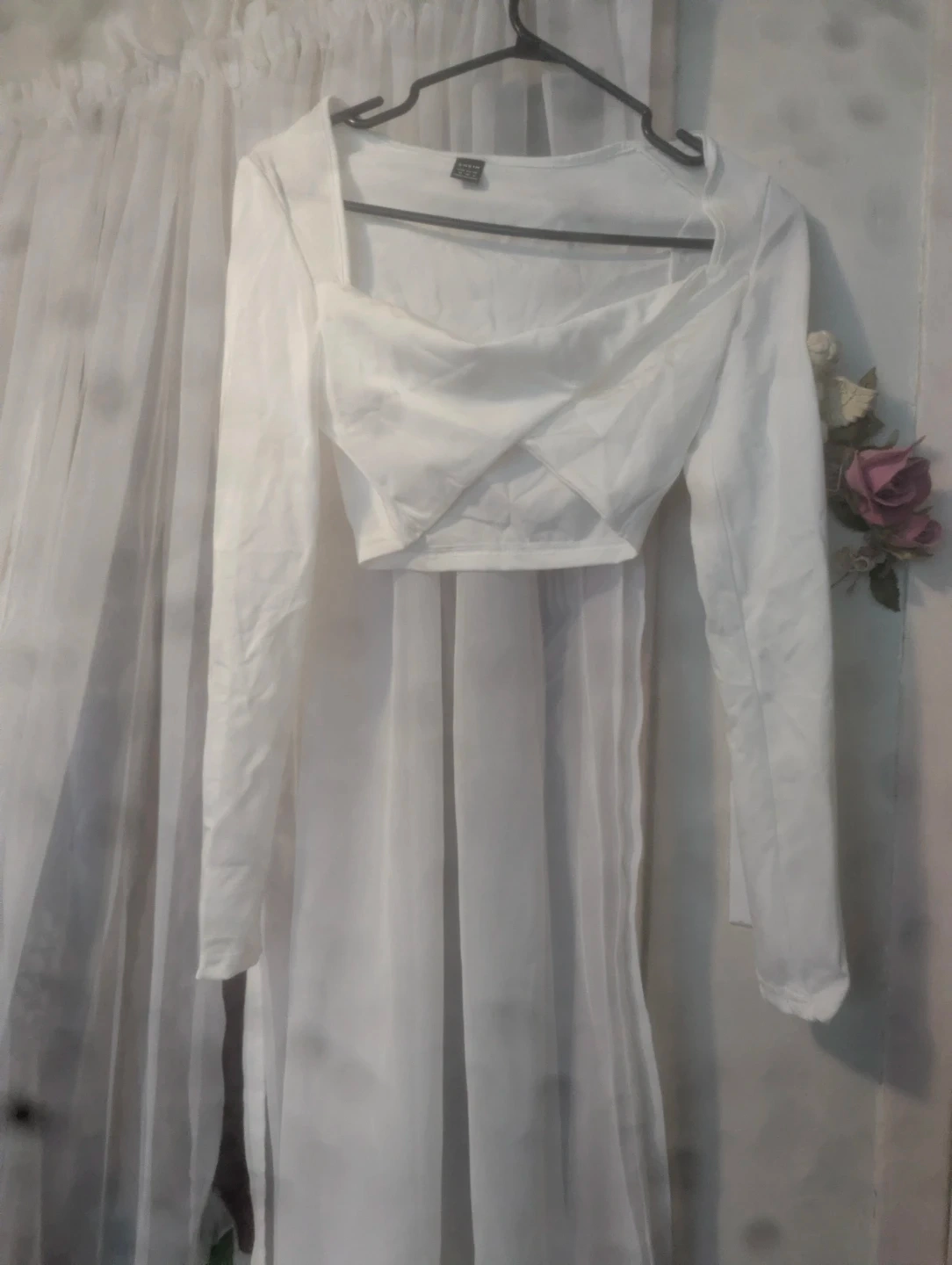 This white SHEIN cropped long sleeve top features a square neckline and a unique criss-cross detail on the bodice. It's made from a lightweight fabric. A great option for layering or on its own!