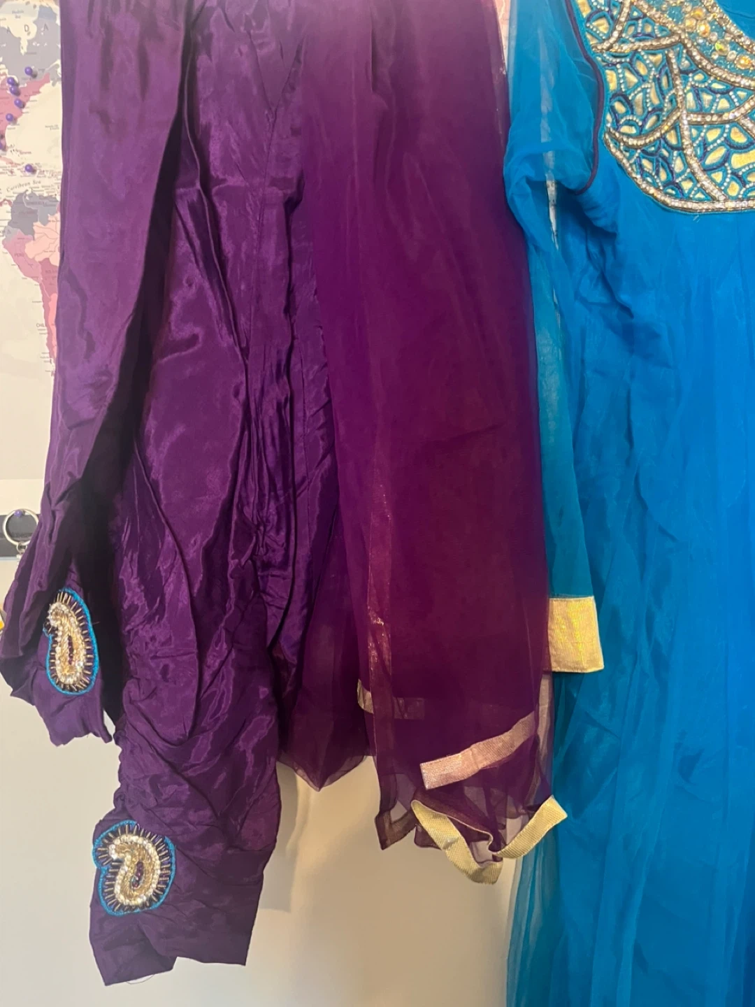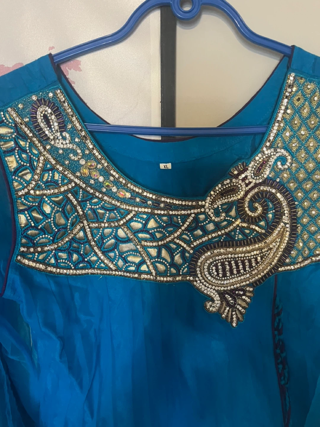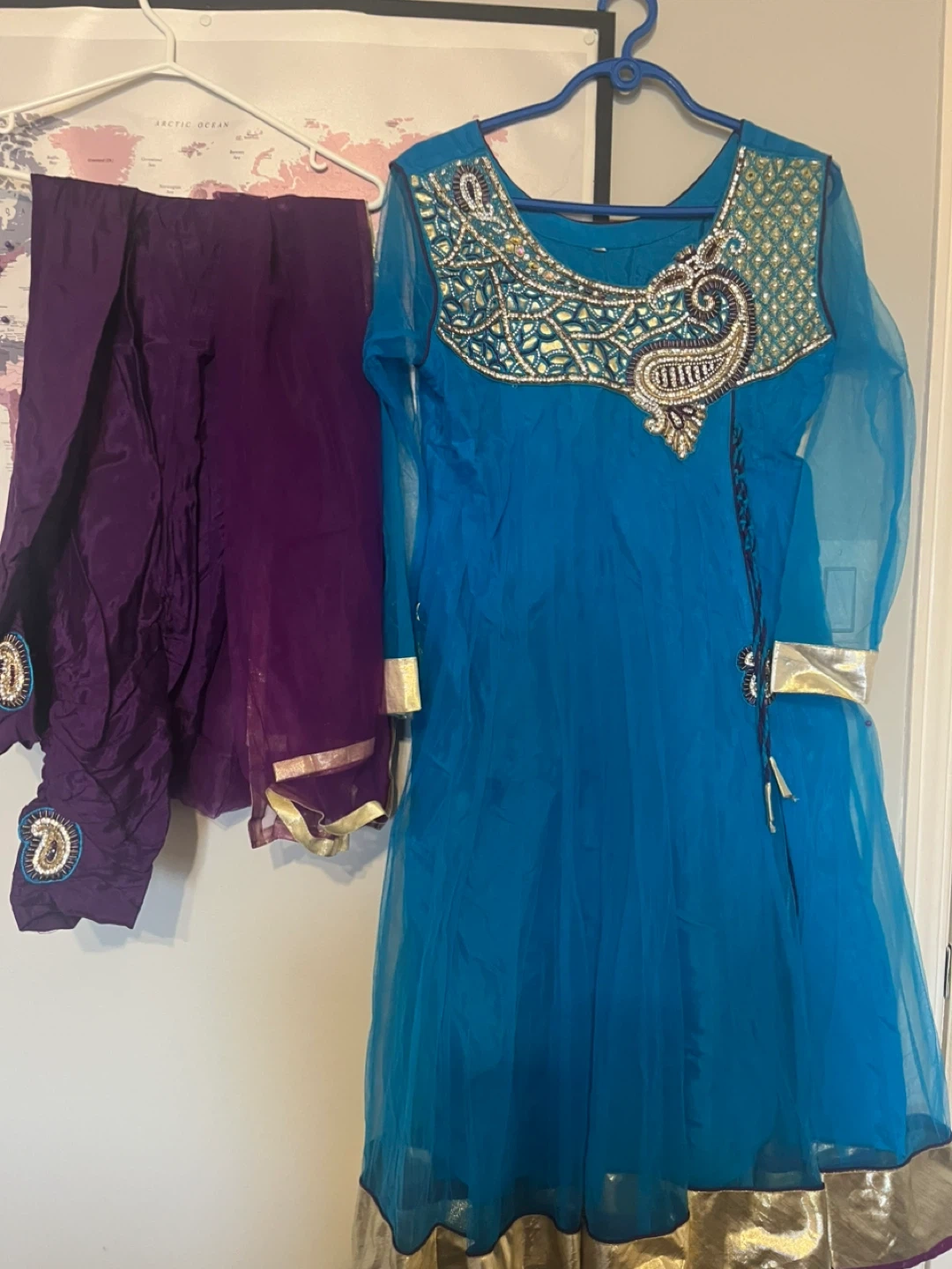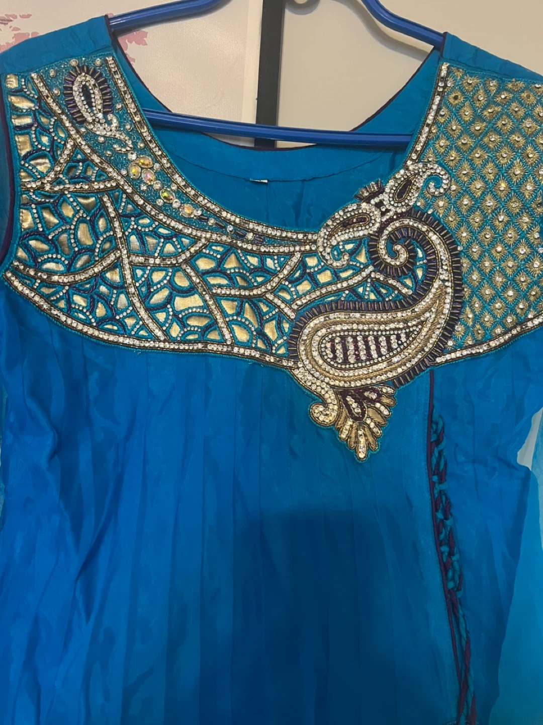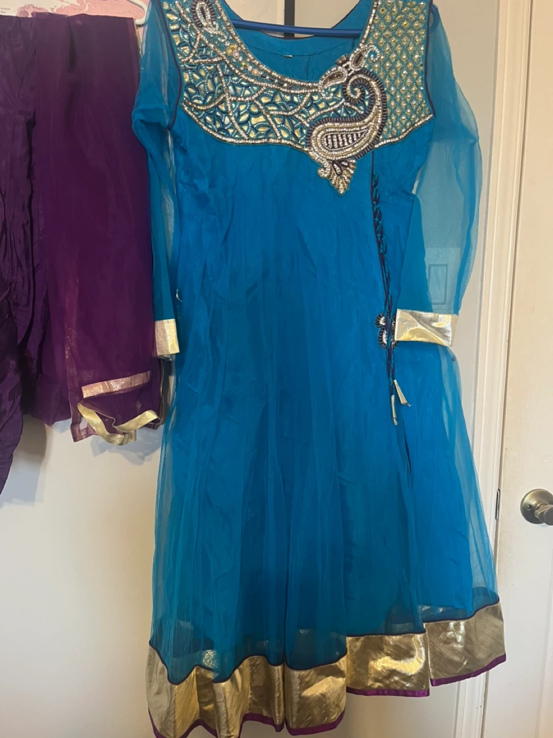 This beautiful anarkali suit features intricate gold and bead embroidery on the neckline and sleeves. It's a vibrant blue kameez paired with purple salwar and dupatta. Size is XL.