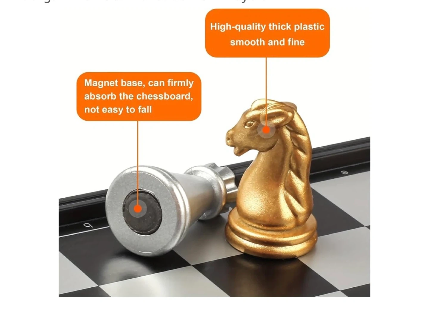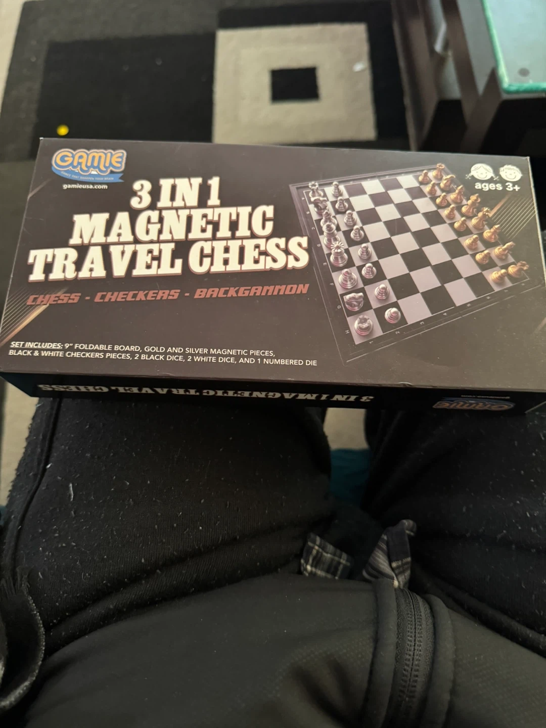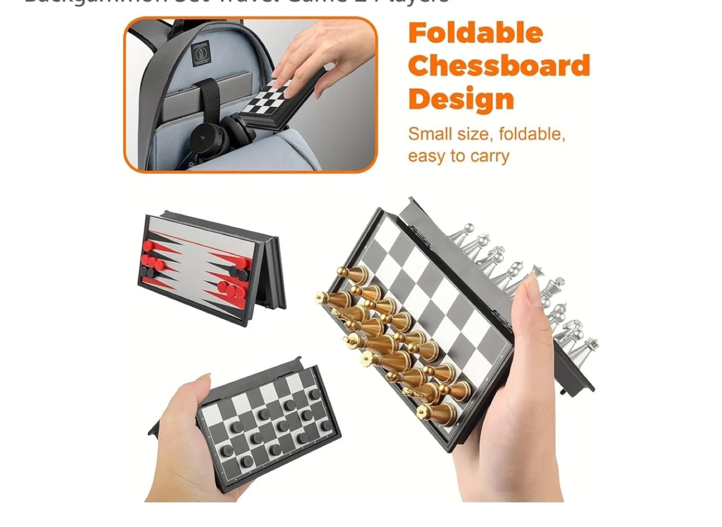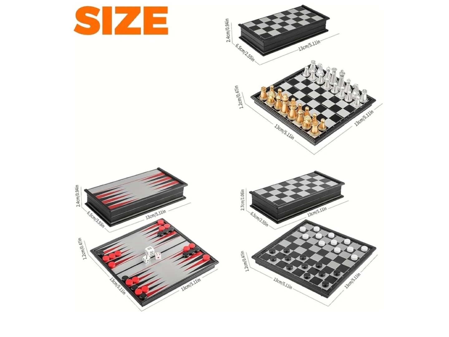 This is a 3-in-1 magnetic travel chess set, including chess, checkers, and backgammon. It features a 9" foldable board with gold and silver magnetic pieces. The set also comes with 2 black dice, 2 white dice, and 1 numbered die. It's small and easy to carry, perfect for travel!