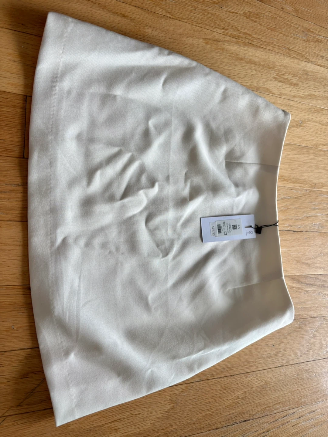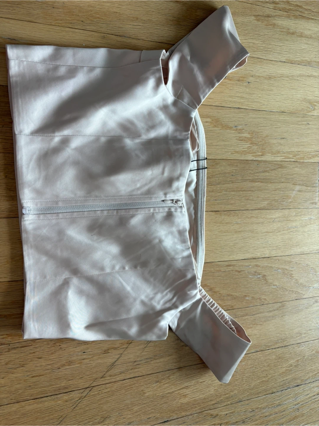 This Dynamite set features a chic pink satin off-the-shoulder top and a beige skirt. Both items have tags attached. The top is made of a silky material, and the skirt is a structured fabric.