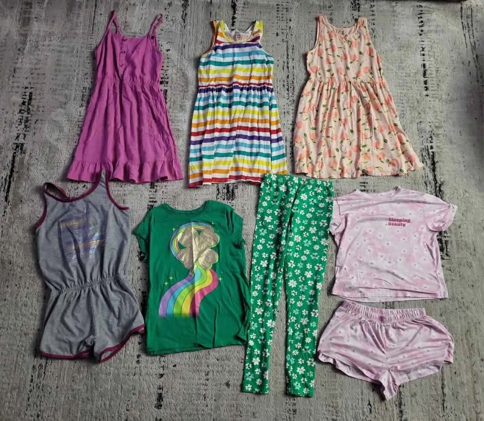 Girls size 14-16 Spring/Summer clothes. Lot #1. Mostly George, Old Navy and Children's Place brands. Includes: 3 dresses, 1 romper, 1 legging, 7 T-shirts, 2 sleeveless tops, 1 top/shorts pajama set, 1 capri pant, 1 skort, and 8 shorts. Cash only.