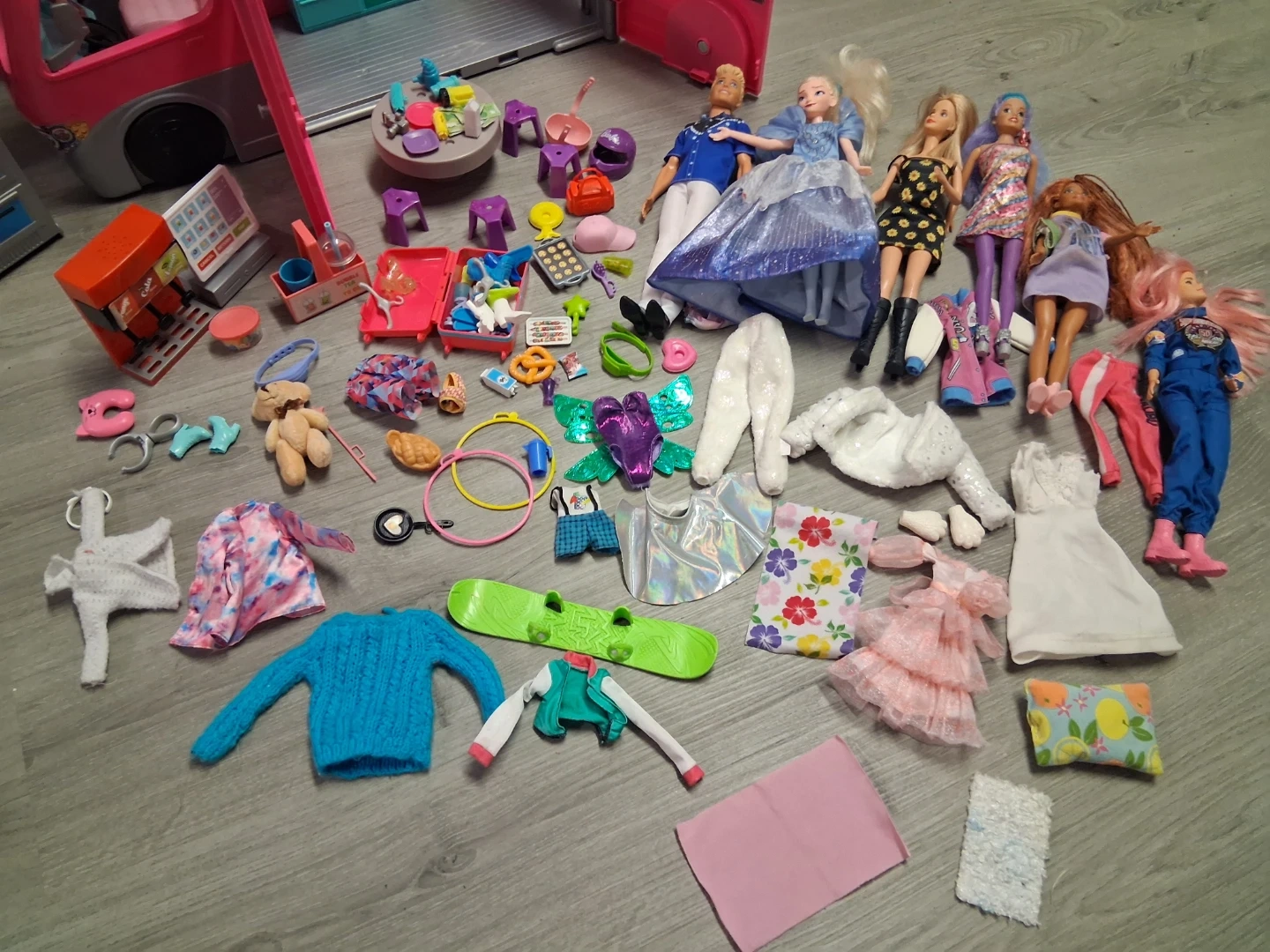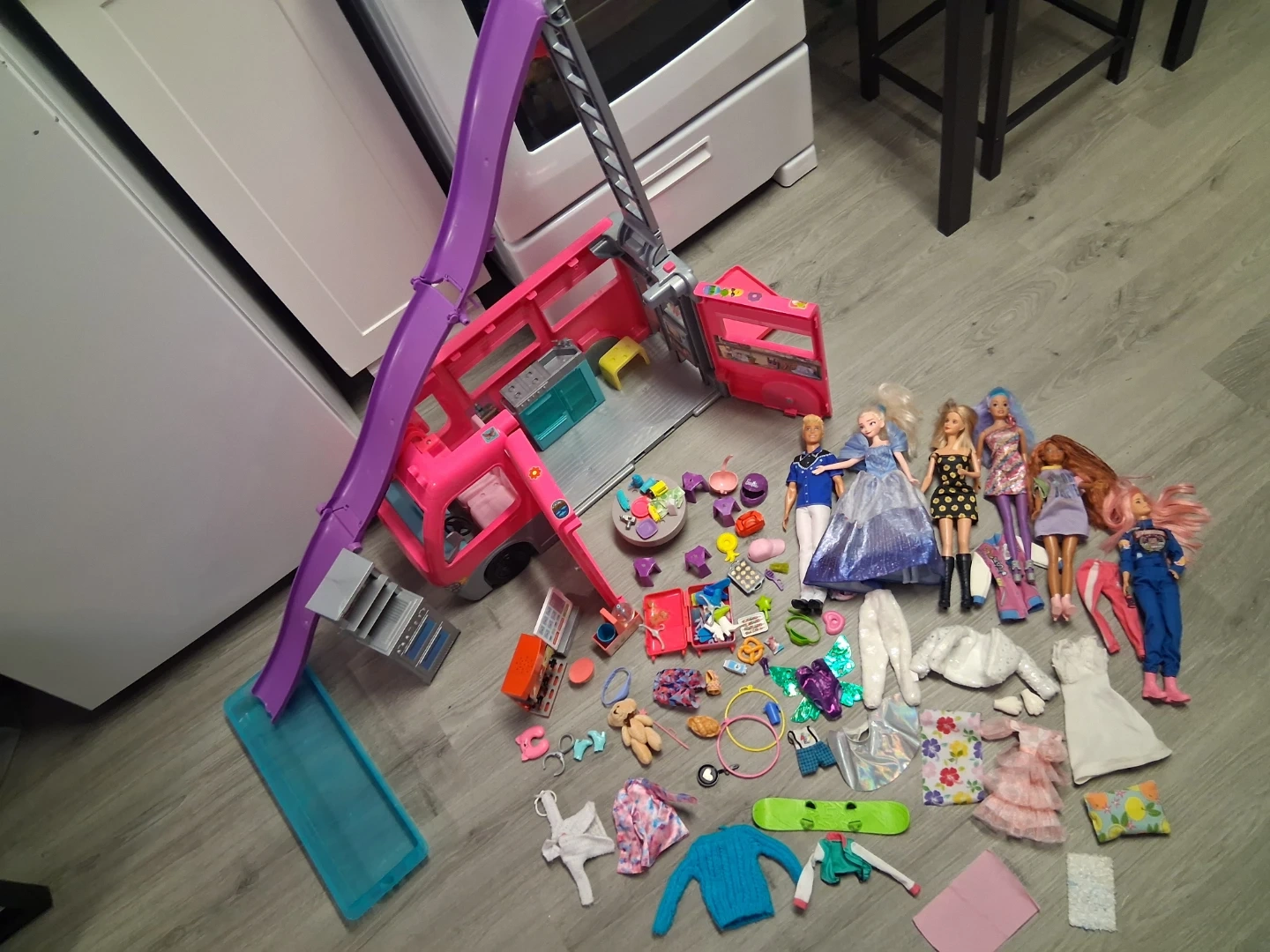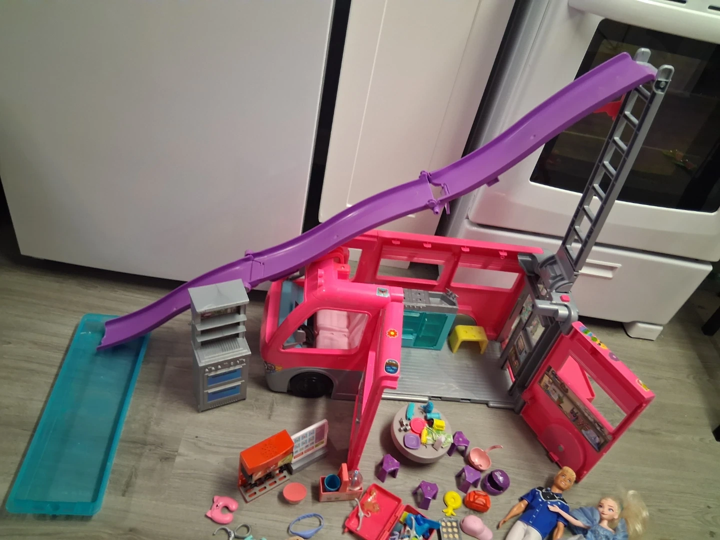 This pink Barbie camper van opens up to reveal a fun playset! It comes with multiple dolls and a variety of accessories for endless adventures. It's perfect for imaginative play.