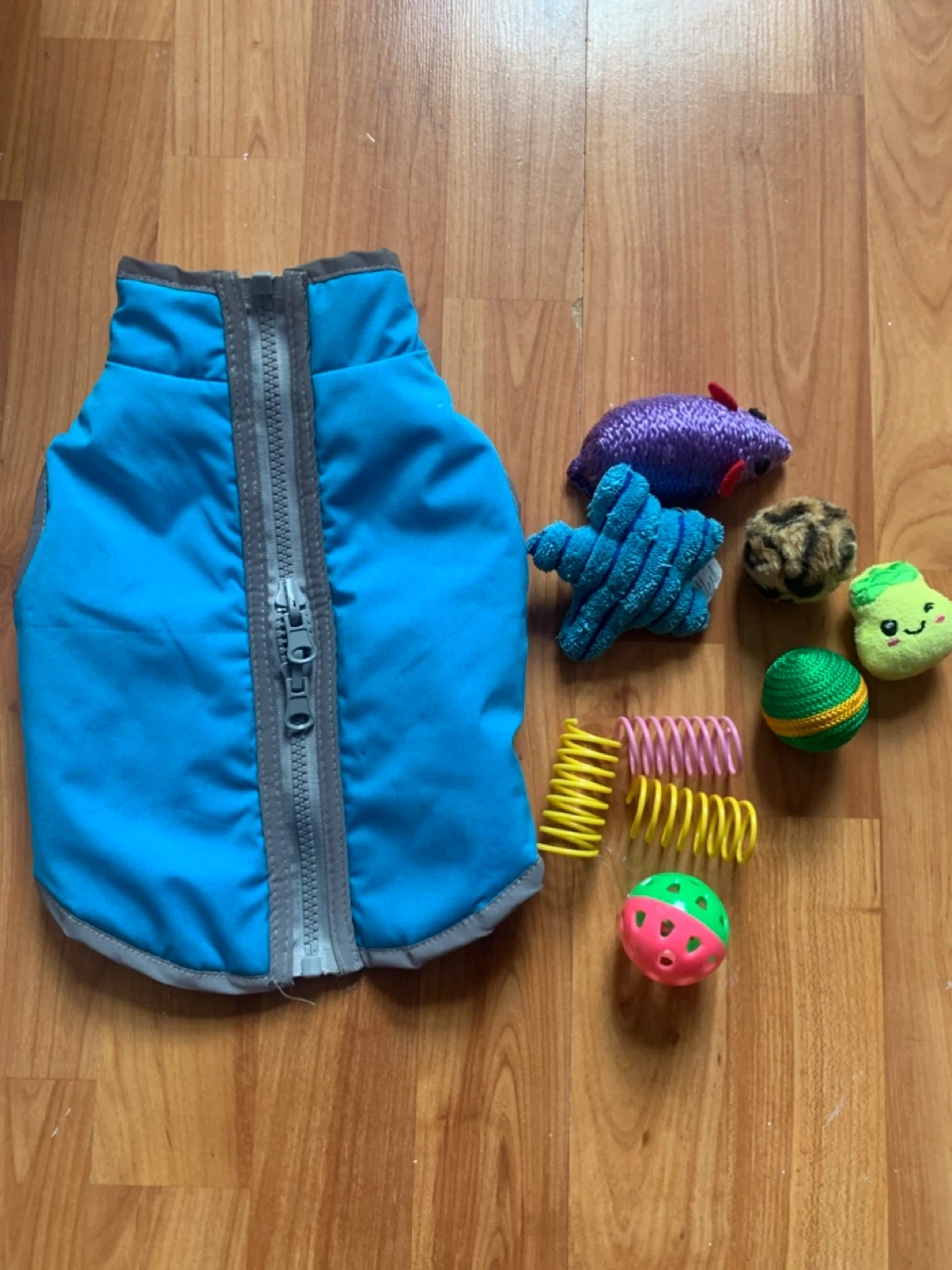 Zipper closure on the front. Comes with a variety of toys including springs, mice, and balls. Vest is made of durable material.