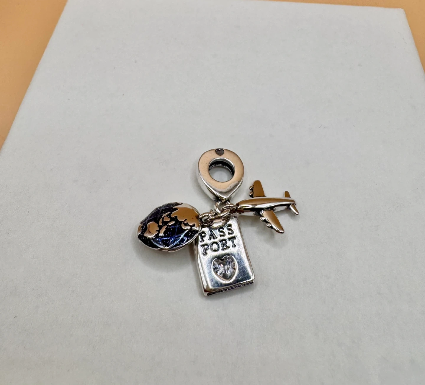 Sterling silver 925 travel charm featuring an airplane, a globe, and a passport with "PASS PORT" engraving. Includes a sparkling accent on the passport. Adds a touch of wanderlust to your bracelet!
