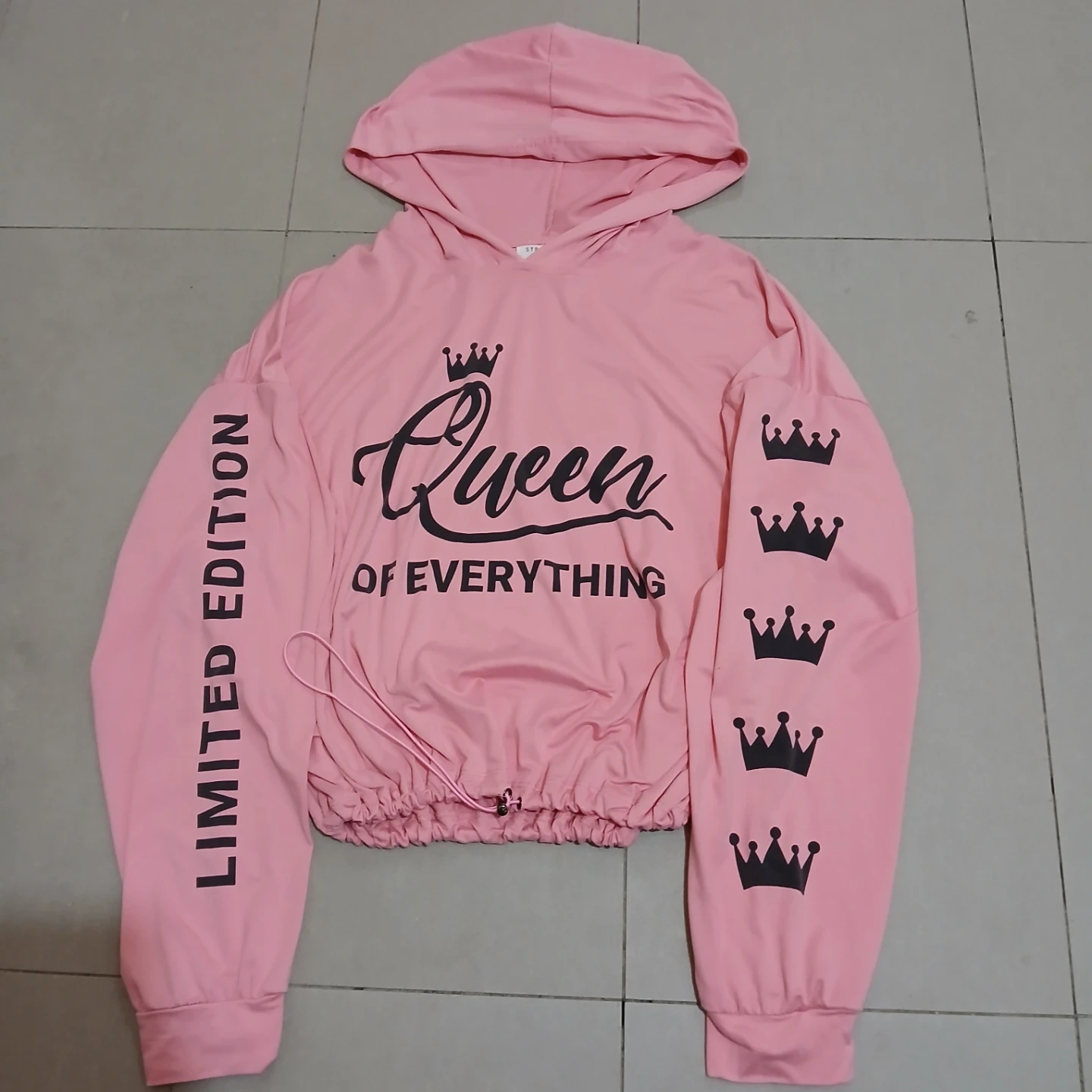 This pink hoodie from Streetwear Society features the "Queen of Everything" graphic and "Limited Edition" on the sleeves. It's a size medium with adjustable drawstrings at the hem.