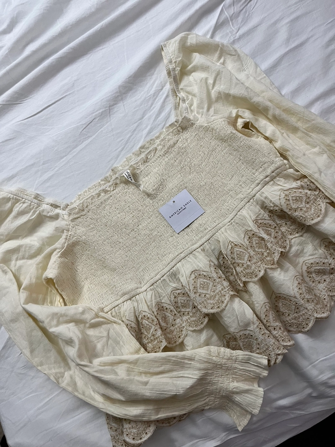 Cream-coloured long-sleeve smocked top. Features a square neckline, tiered ruffle bottom, and delicate embroidery. Long sleeves and a fitted bodice. Excellent condition.