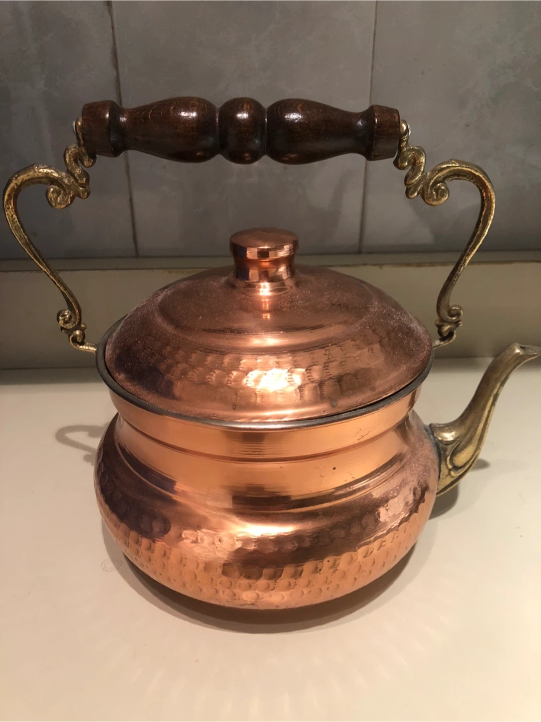 Selling a vintage copper kettle featuring a unique wooden handle and brass accents. It has a lovely hammered texture. A charming piece for your kitchen or collection!