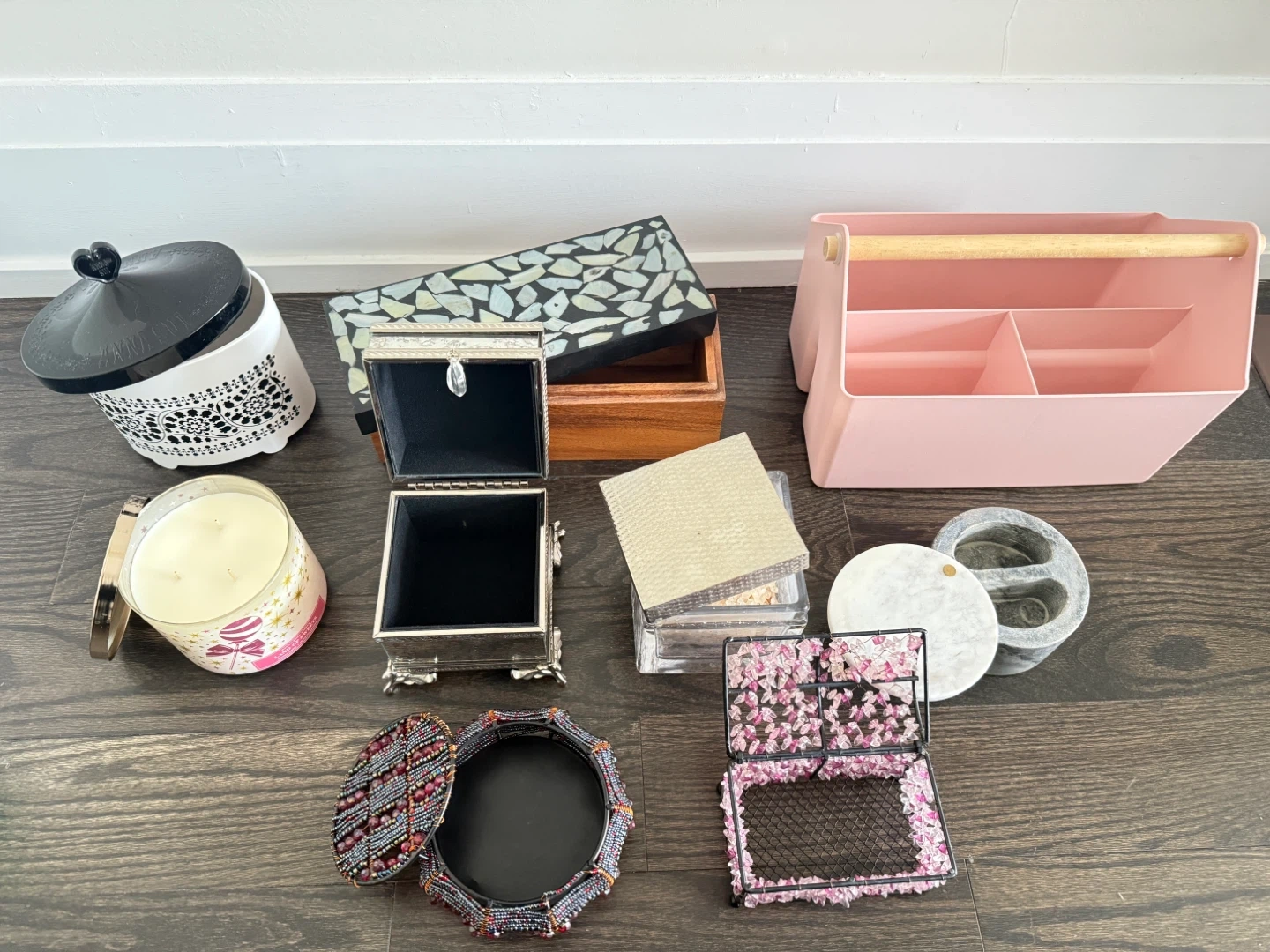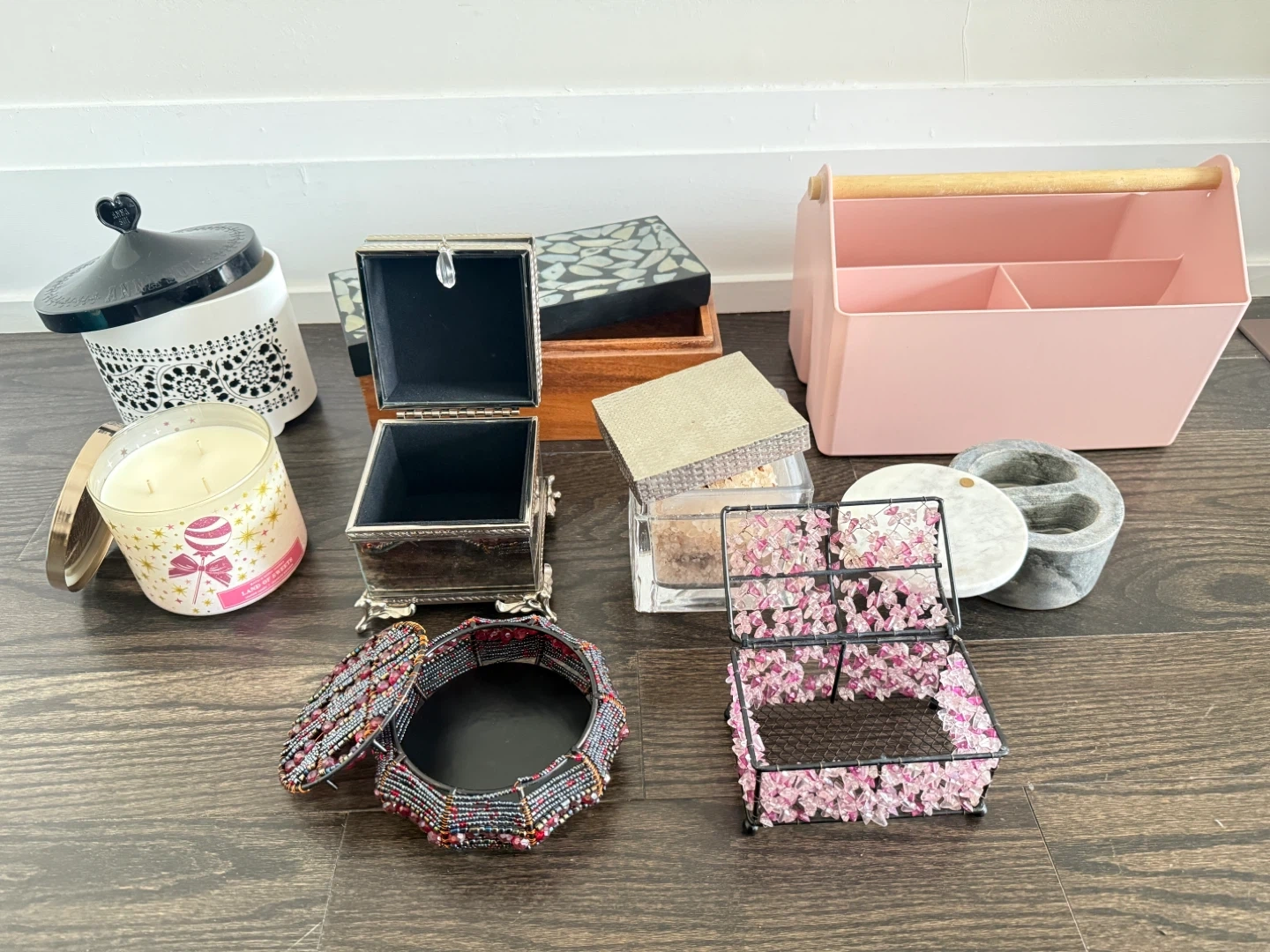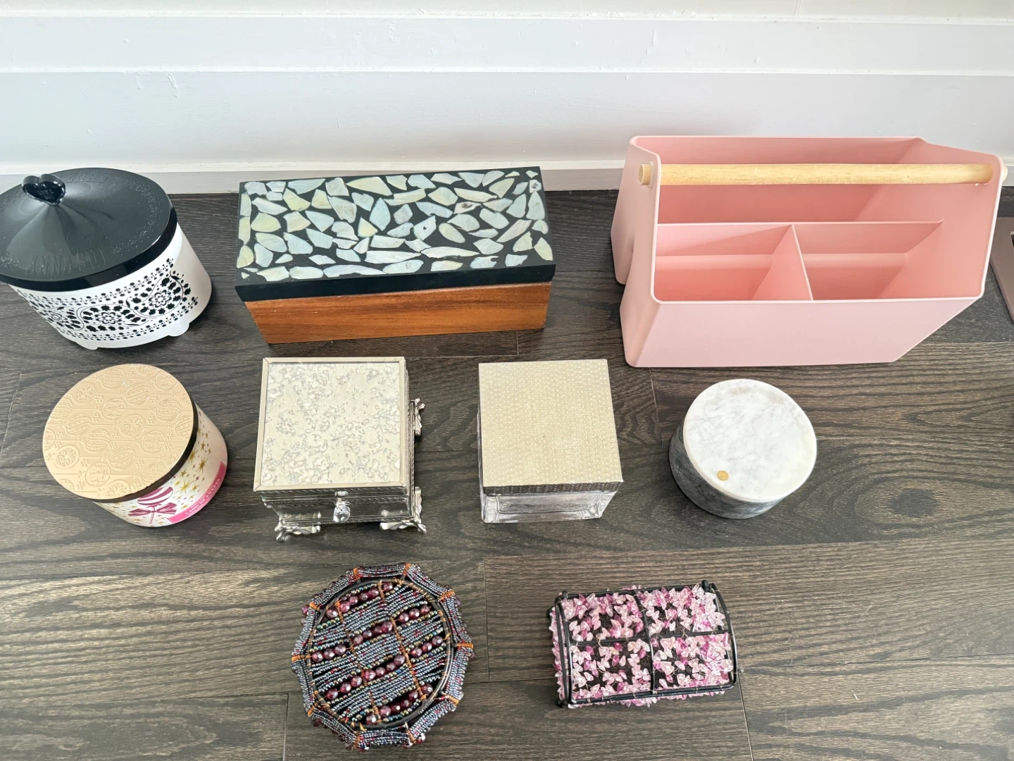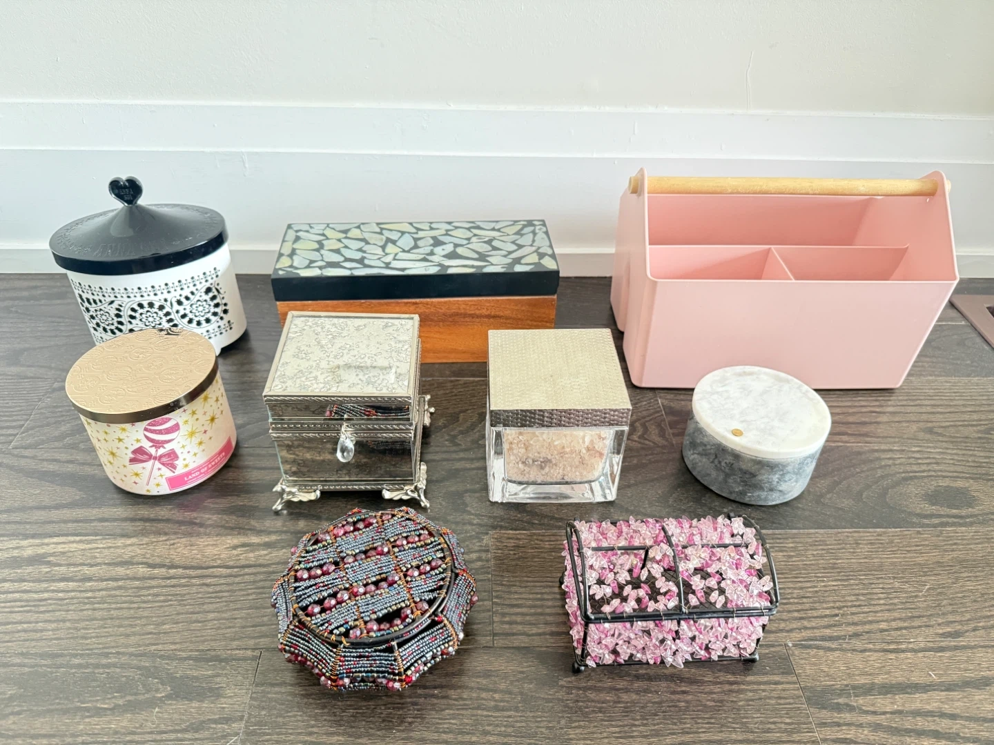 This collection includes a variety of decorative storage items. You'll find a large white ceramic jar with a black lid, a wooden box with a mosaic-style lid, and a pink plastic caddy with a wooden handle. There's also a silver-tone trinket box, a clear acrylic box, a round grey marble container, and a small pink floral storage box. A beaded decorative box and a scented candle complete the set.