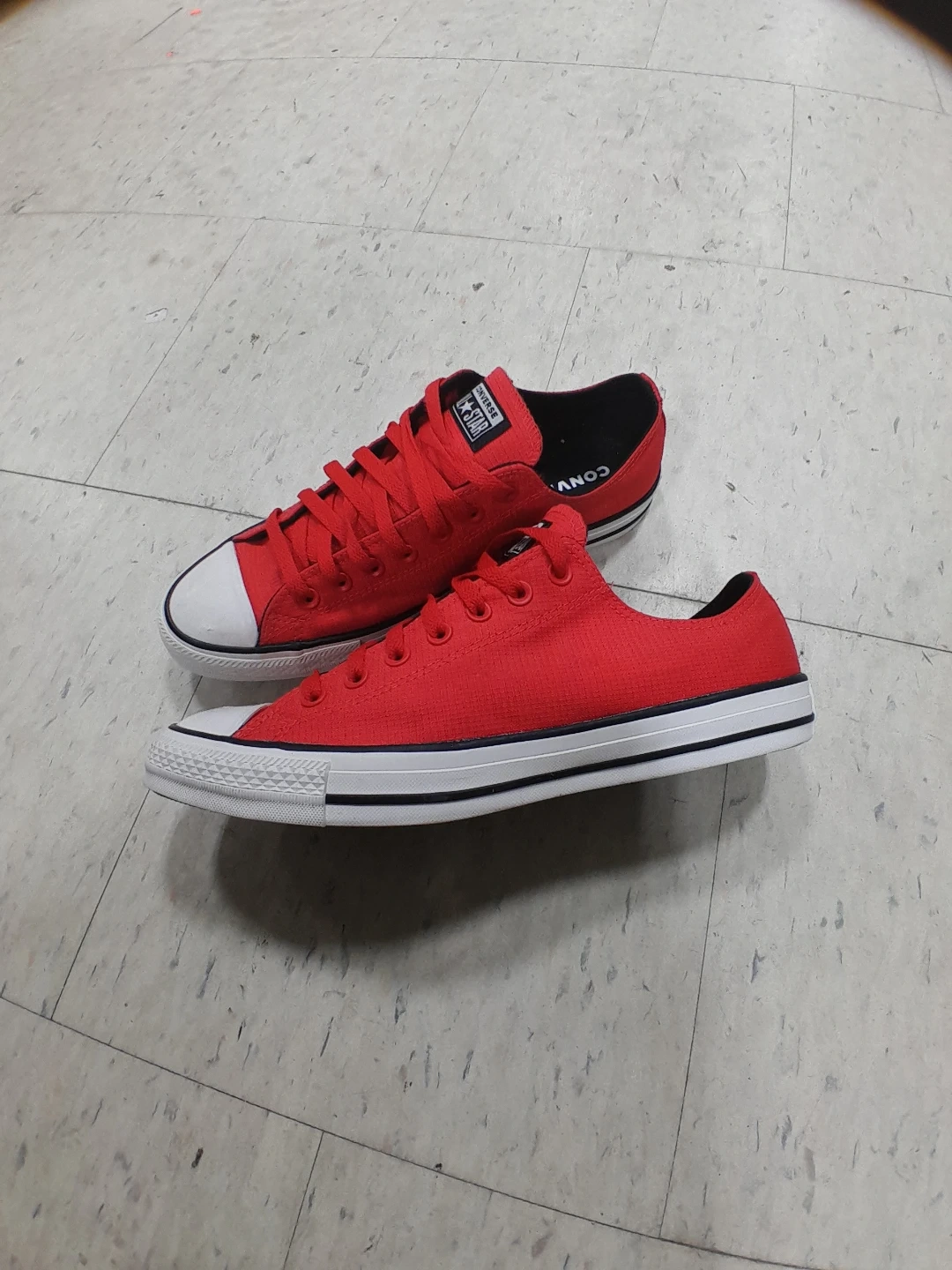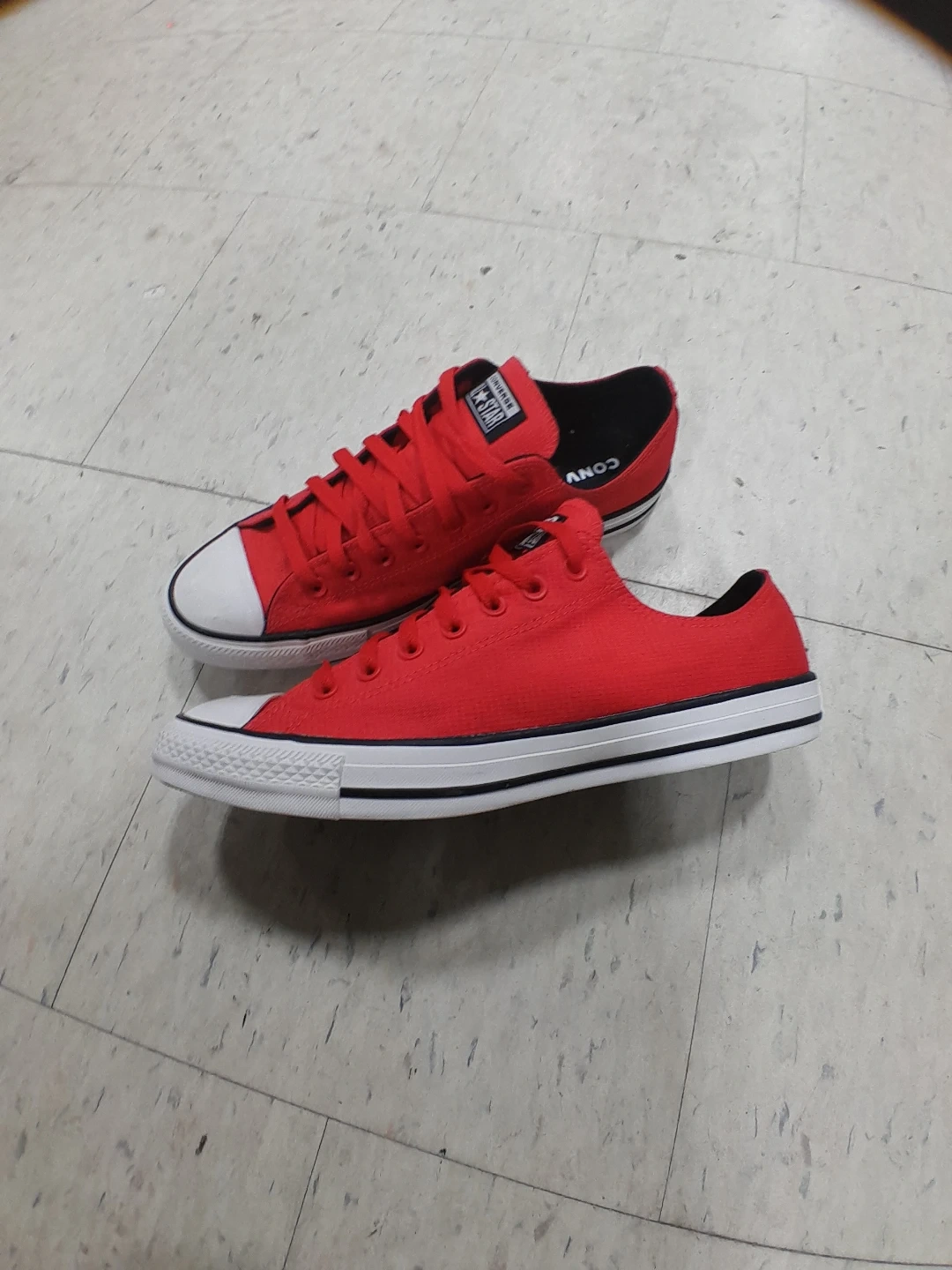 Classic red Converse All Star low top sneakers. Canvas upper with rubber toe cap and sole. Lace-up closure. Perfect for everyday wear! Men's Size 10