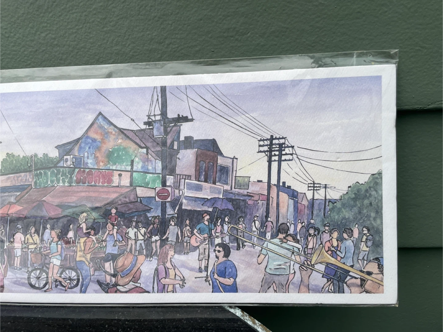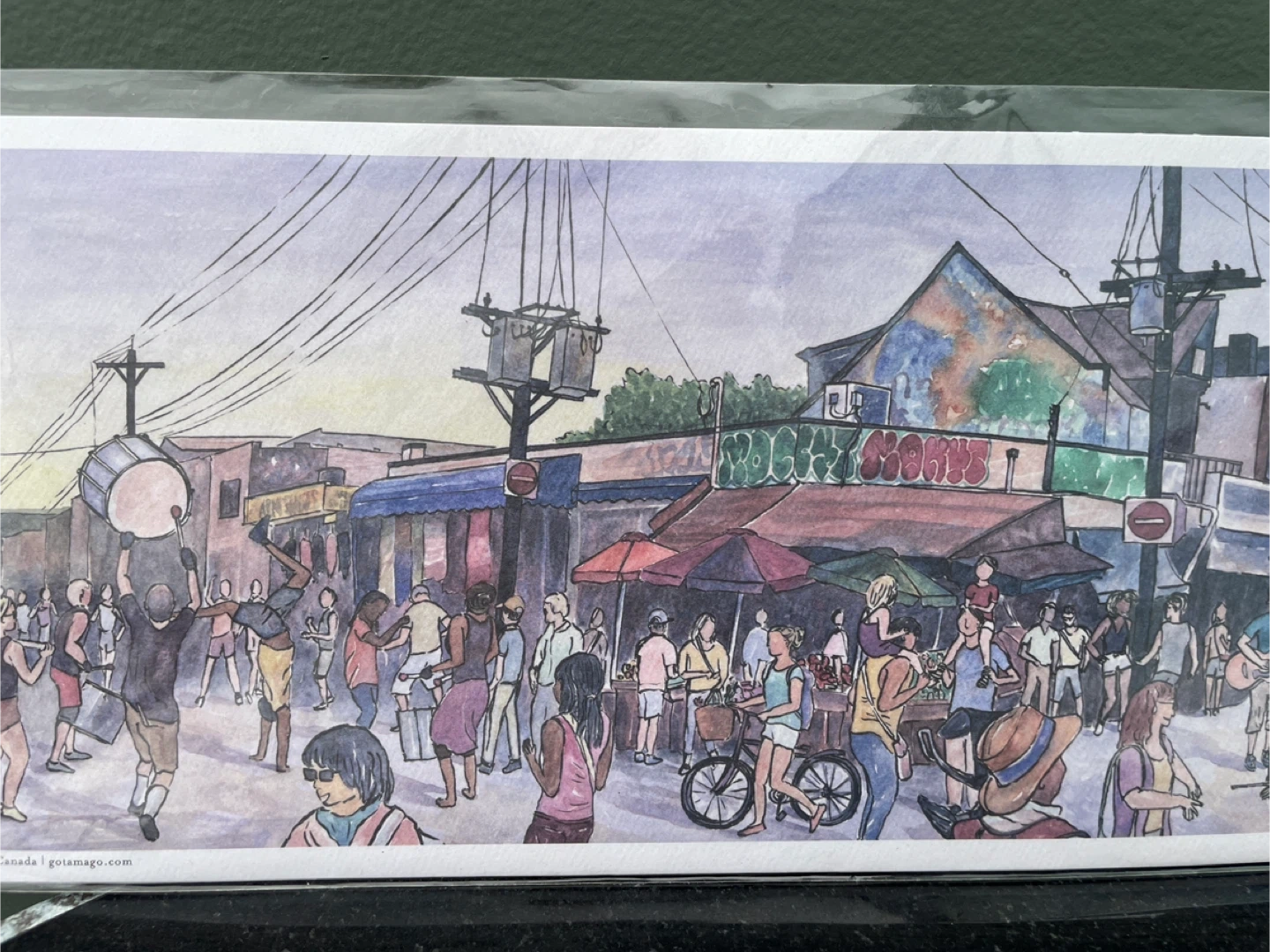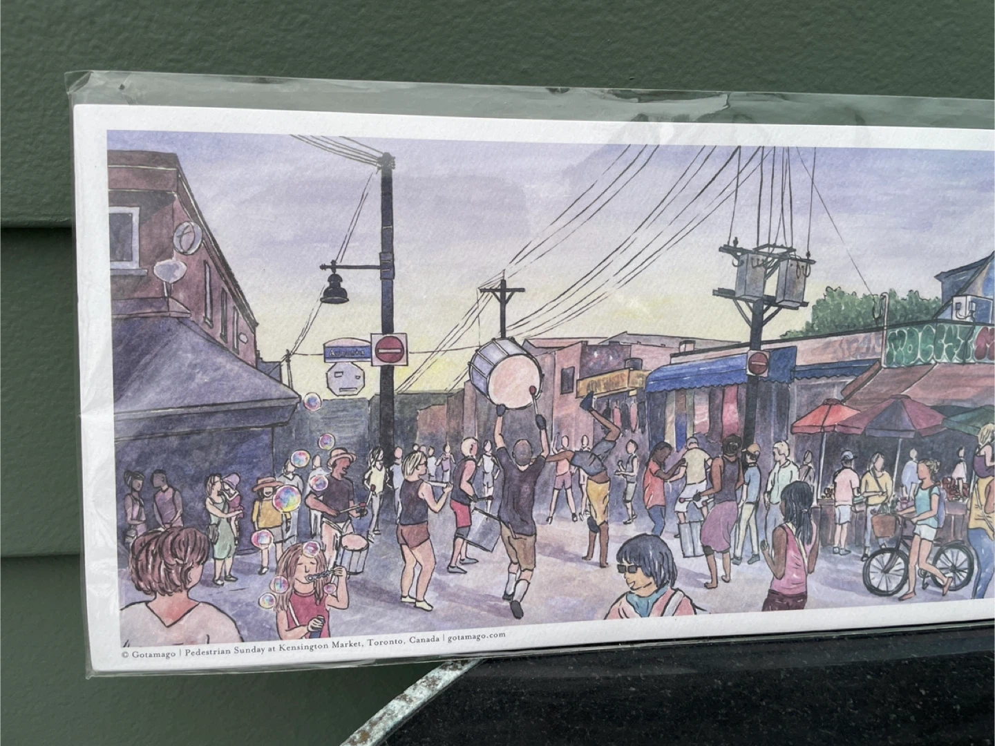 Art print depicting "Pedestrian Sunday at Kensington Market, Toronto". It's a colourful watercolour scene of a lively street market with musicians and crowds. The print measures 12 inches by 5 inches. Brand new