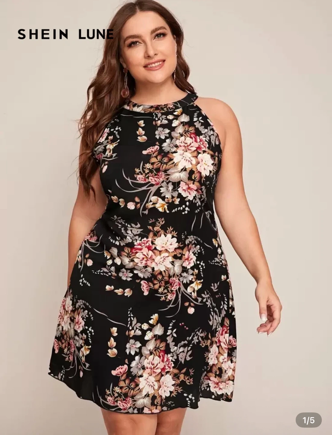 SHEIN LUNE floral print halter neck dress. It's a sleeveless style with a short hem. This dress is made with fabric that drapes nicely.