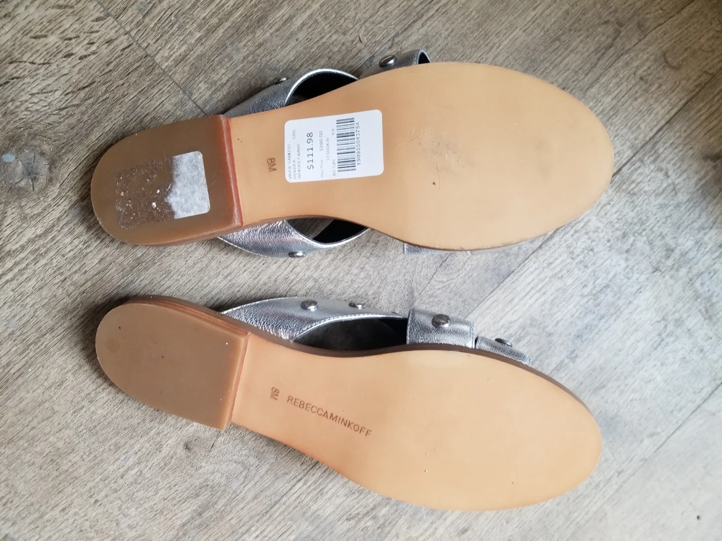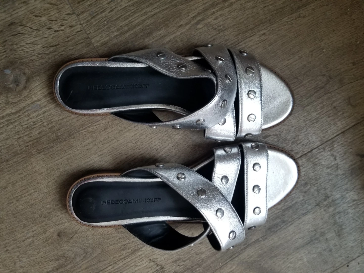 These are REBECCA MINKOFF slide sandals in a silver metallic finish. They feature a criss-cross strap design with stud detailing. The size is 8. Brand new