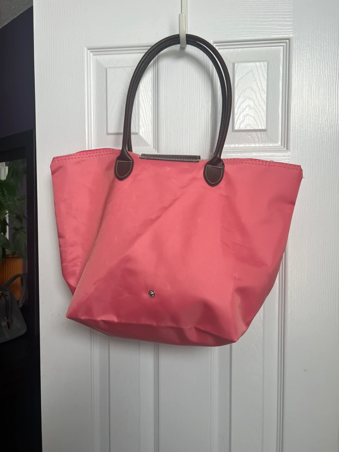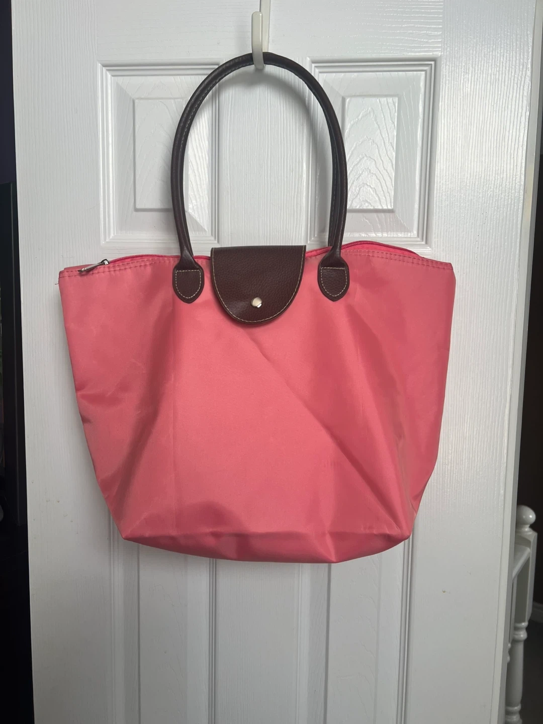 A stylish pink nylon tote bag with brown leather handles. It's great for everyday use! The interior has multiple compartments for organization.