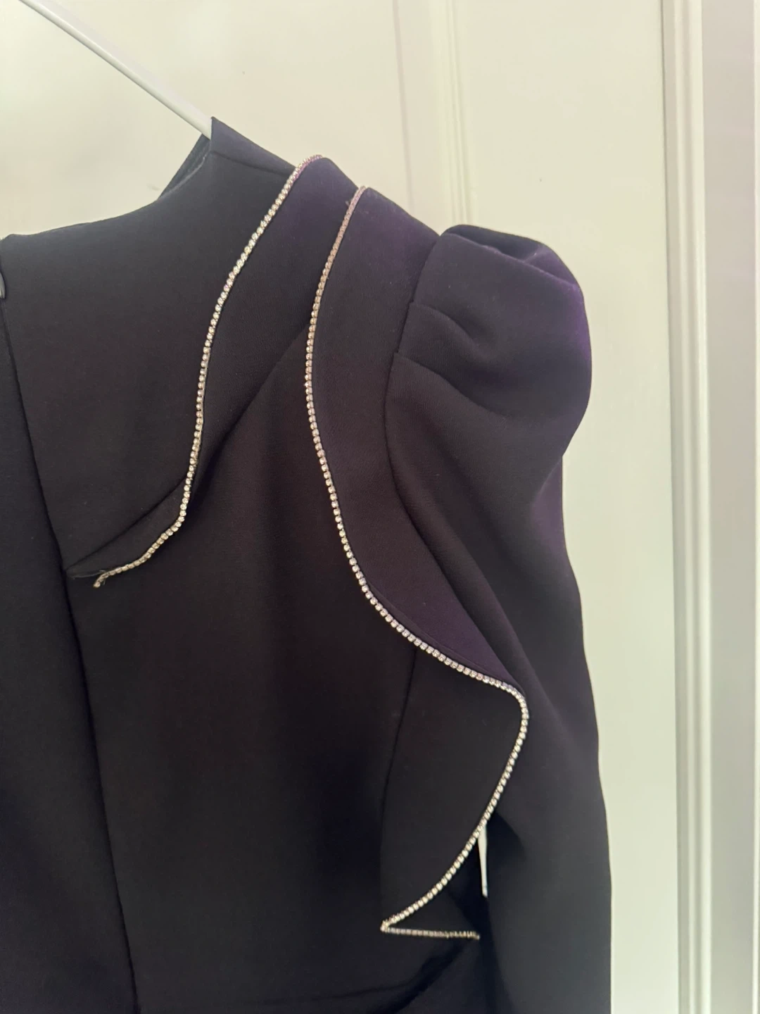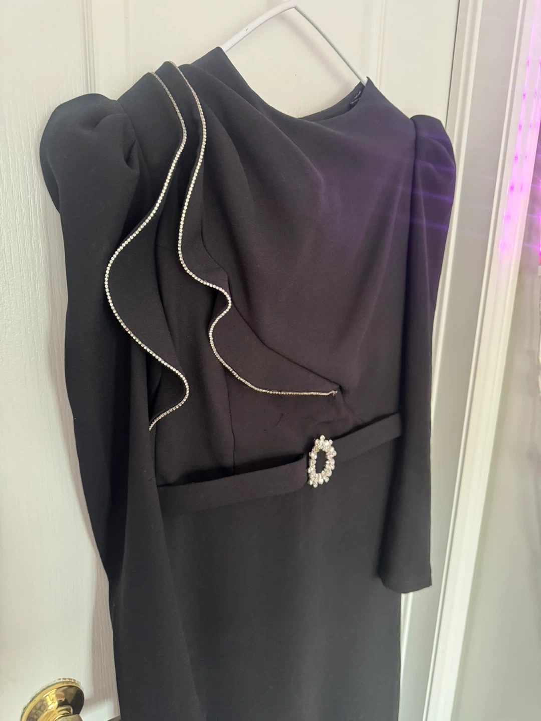 I'm selling a beautiful black dress that's perfect for a night out or a special occasion! It has a unique rhinestone detail along the neckline and a rhinestone buckle at the waist. The dress is in great condition and ready for a new home!