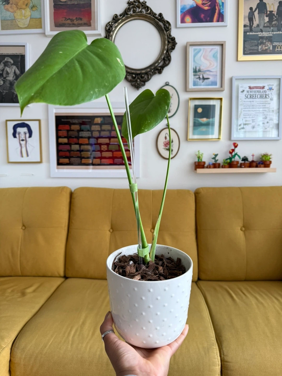 Monstera Deliciosa plant in a white textured pot.Comes with a clear support stake. Potting mix is a soilless.