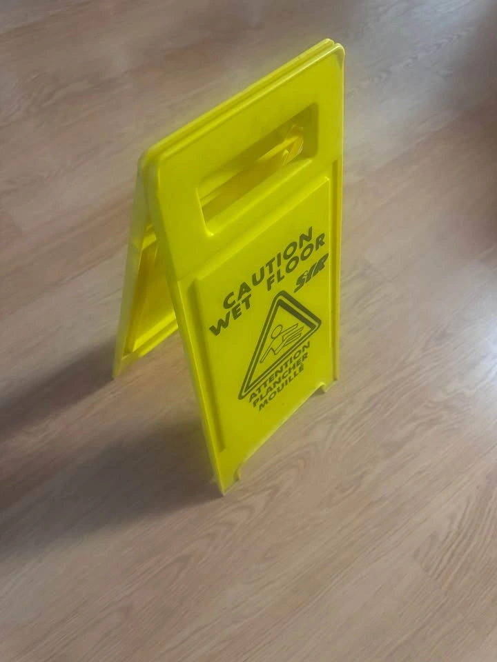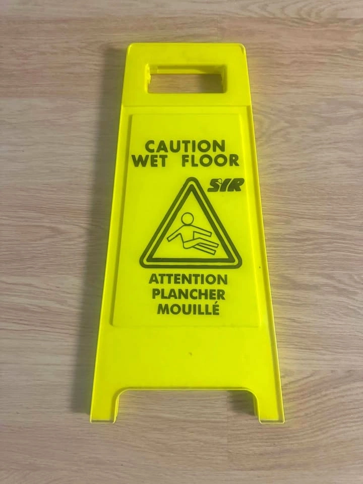 Bright yellow wet floor sign with 'CAUTION WET FLOOR' in English and 'ATTENTION PLANCHER MOUILLÉ' in French. SIR brand, A-frame design. Pickup at Bathurst and Centre or Yonge and Steeles. Cash only please!