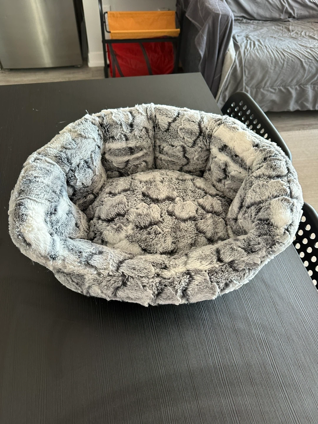 Includes a soft, grey and white plush pet bed and a wire dog crate with a black plastic tray. The crate is collapsible for easy storage. Great for small to medium-sized dogs!