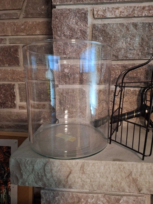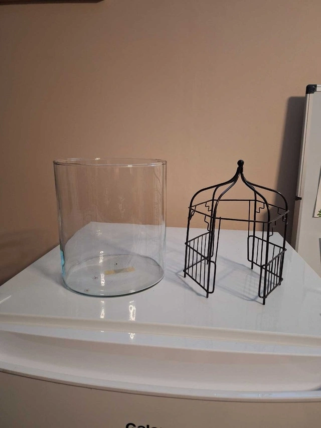 Glass terrarium, approximately 8 inches high and 6 inches round, with a decorative metal gazebo frame. Perfect for a succulent plant garden, dried floral arrangement, or sand castle. Asking $10 cash. Curbside pickup in South Ajax. Very good condition.