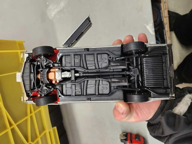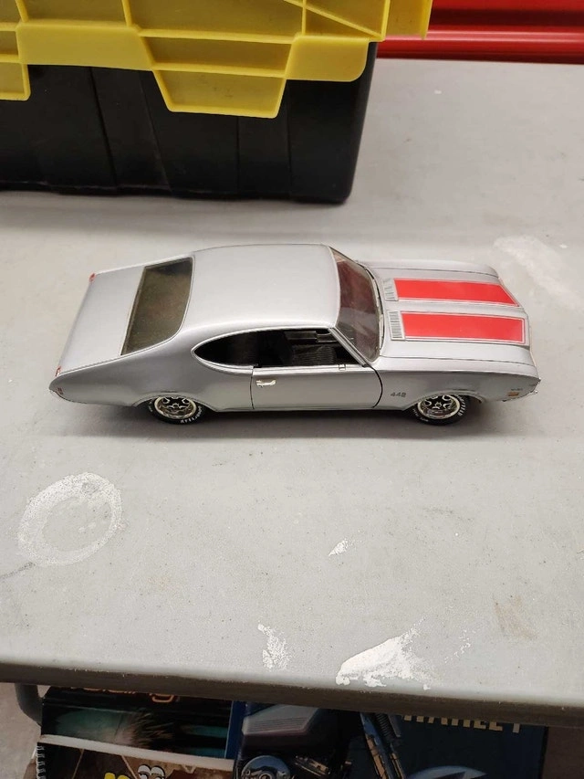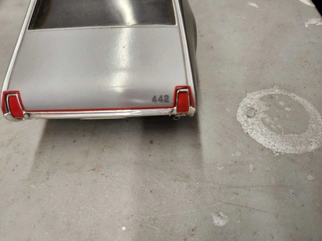 Selling a collectible 442 Oldsmobile diecast car in a detailed silver and red finish. This model captures the iconic look of the classic muscle car with a meticulous design, perfect for collectors or enthusiasts. It has been displayed on a shelf and is ready for a new home. If the ad is still up, this beauty is available. Cash accepted.