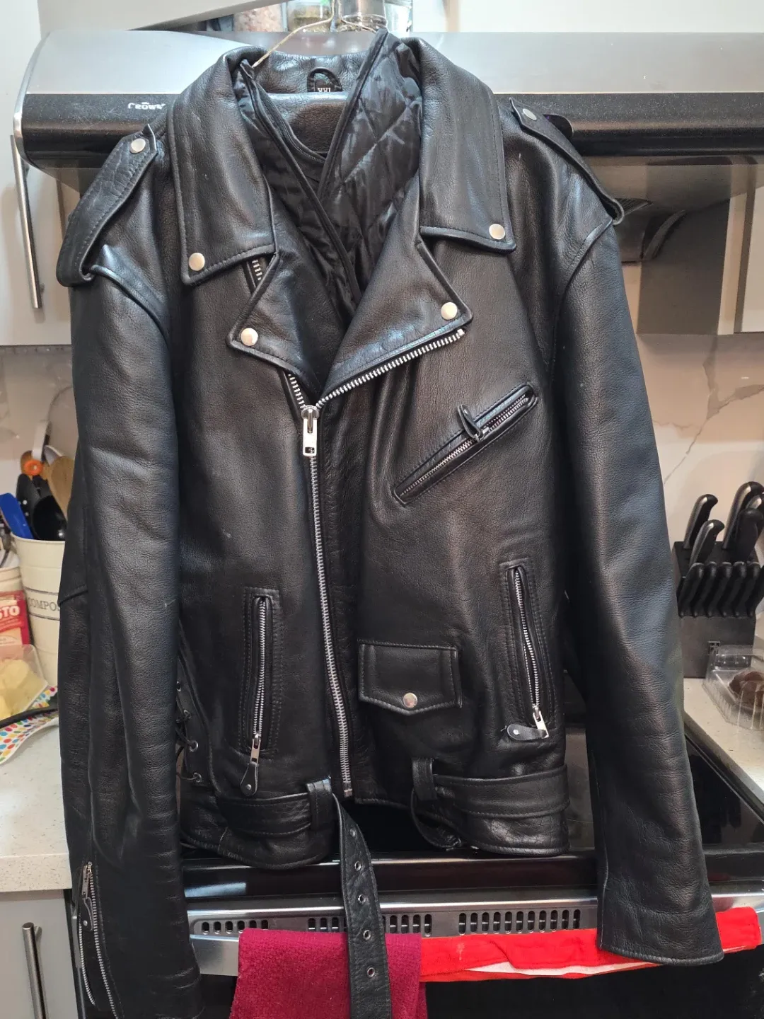 This black leather motorcycle jacket features a classic biker style. The back has an embossed eagle design with the text 'LIVE TO RIDE RIDE TO LIVE'. It includes multiple zippered pockets and a belt at the waist. It's made of genuine leather.
