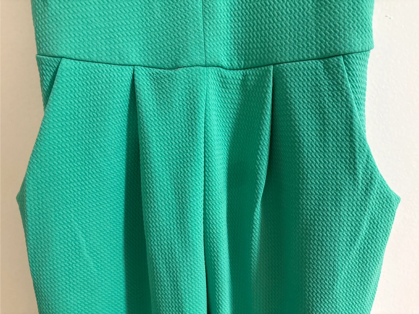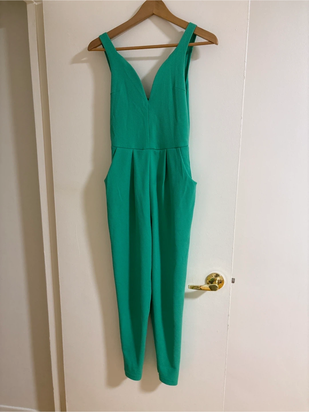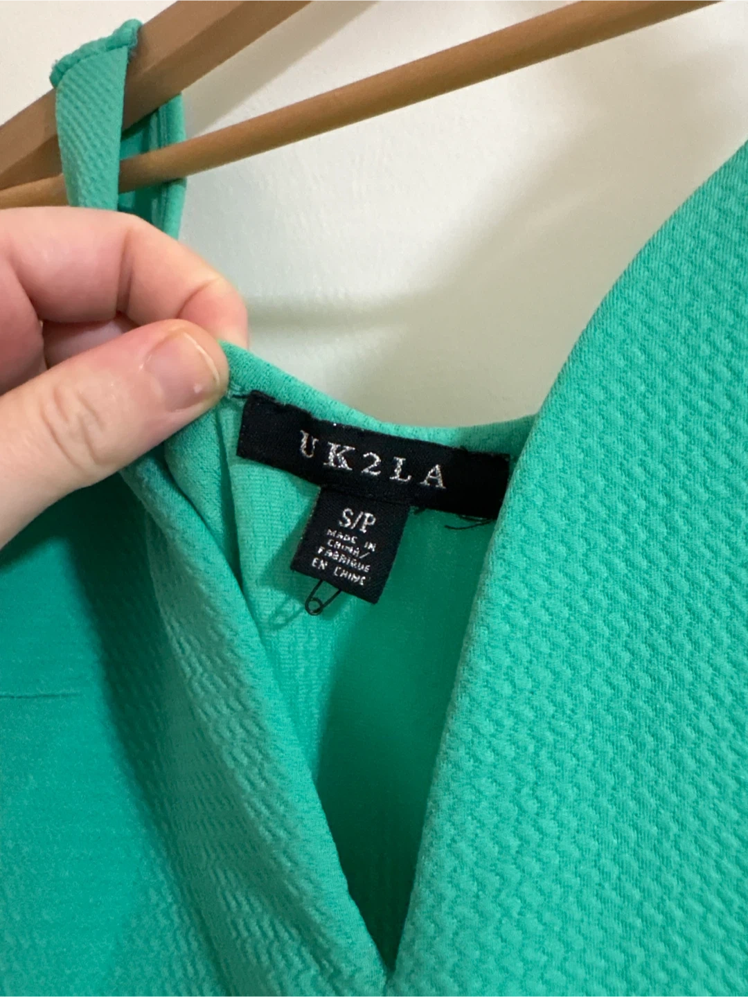 This vibrant green jumpsuit from UK2LA features a flattering V-neck and a textured fabric. It's a size S/P with convenient pockets. Made in China.