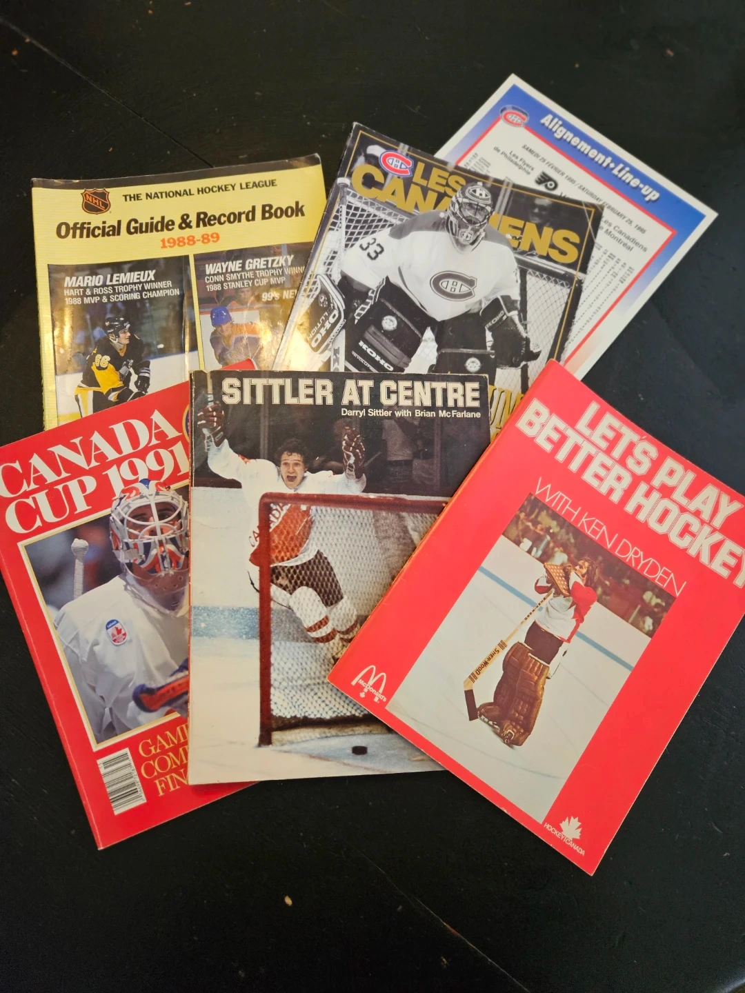 This lot includes several hockey-related publications. You'll find the NHL Official Guide & Record Book from 1988-89, 'Sittler at Centre,' 'Canada Cup 1991,' 'Let's Play Better Hockey with Ken Dryden,' and a 'Les Canadiens' alignment line-up from 1995. Great reads for any hockey fan!