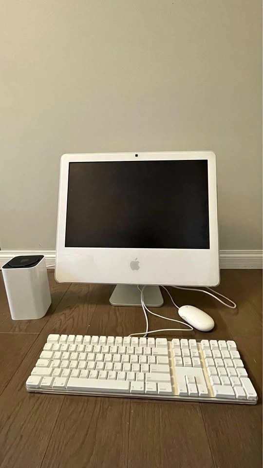 Older iMac 5,1 with 20” monitor, keyboard, and mouse. Works well. Upgraded to 4GB new memory and a 250GB hard drive. Has various older Adobe applications installed (PS, Adobe Illustrator, Adobe InDesign, Adobe Bridge, Adobe Professional). Includes Apple Airport external WiFi Router with 2TB storage.