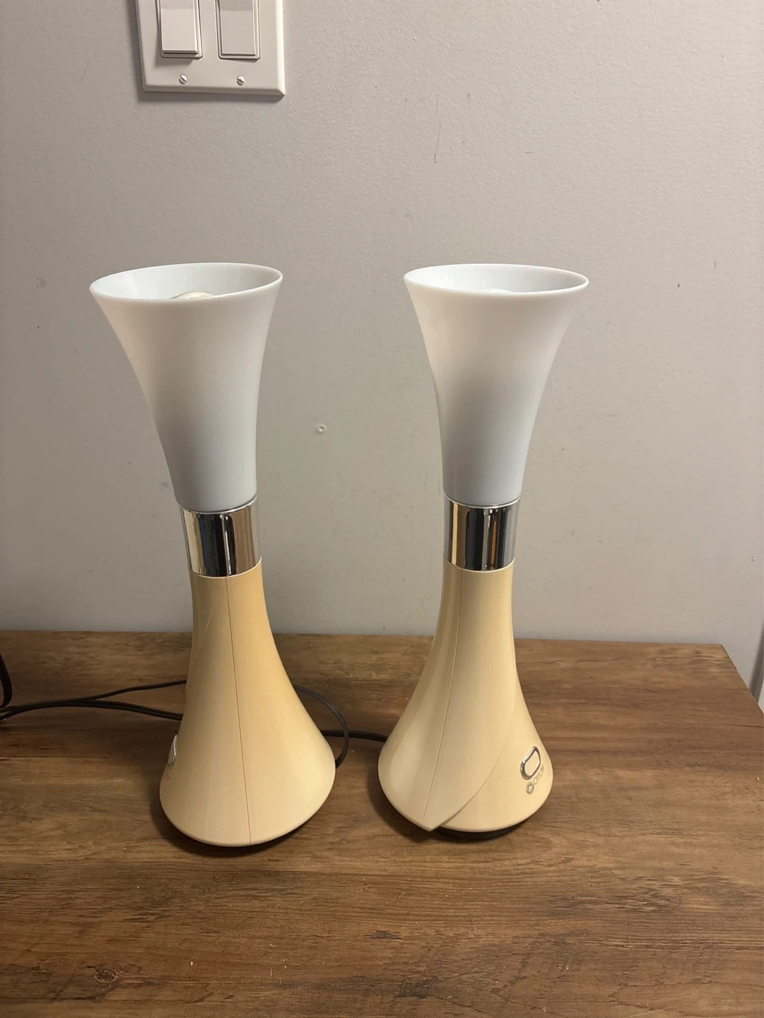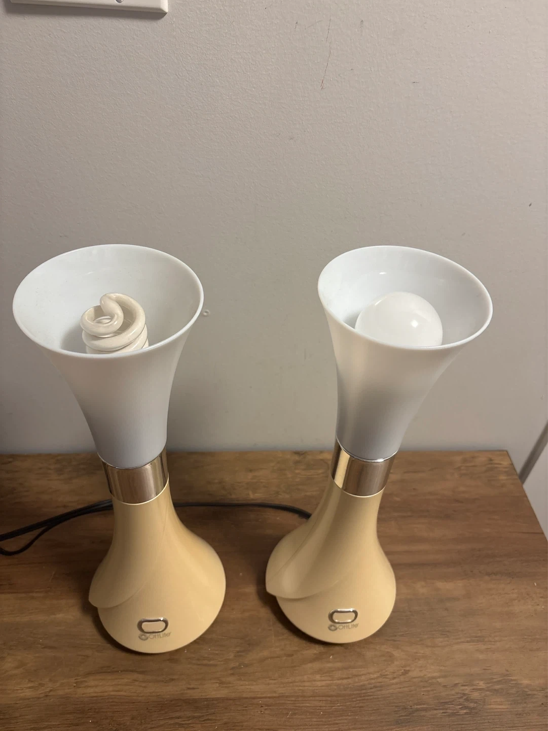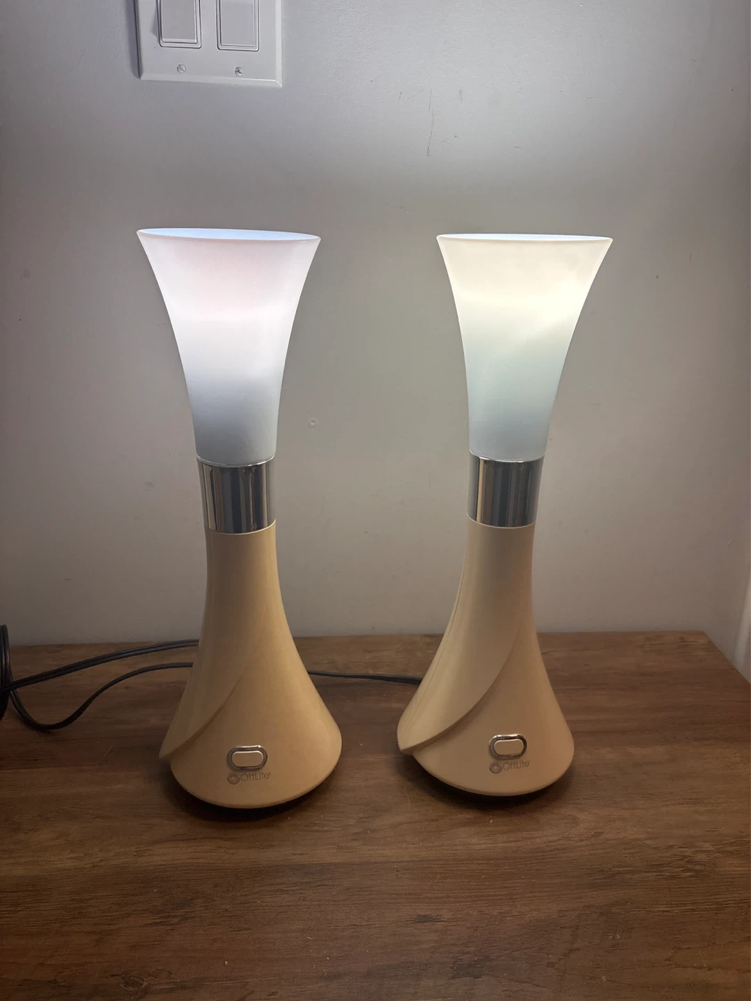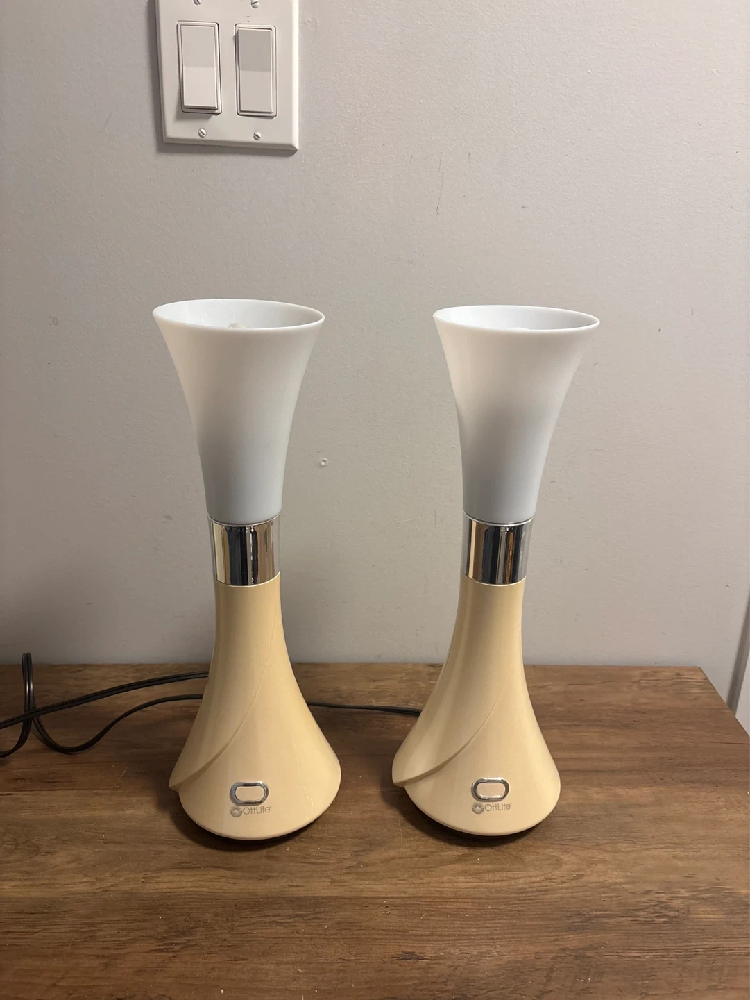 Selling a pair of OttLite table lamps. Beige base with a frosted white shade. Each lamp has an on/off switch. Includes the light bulbs shown.