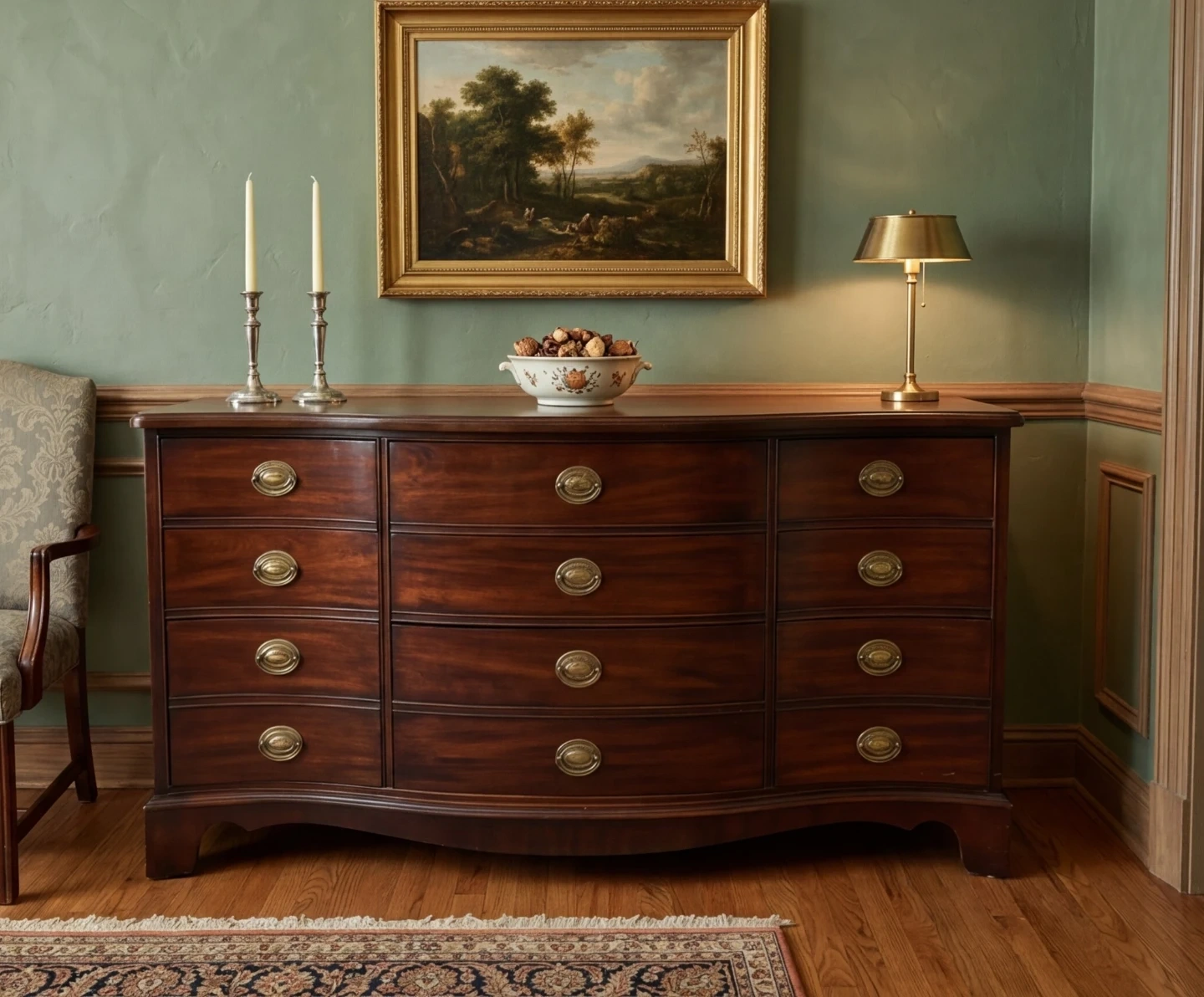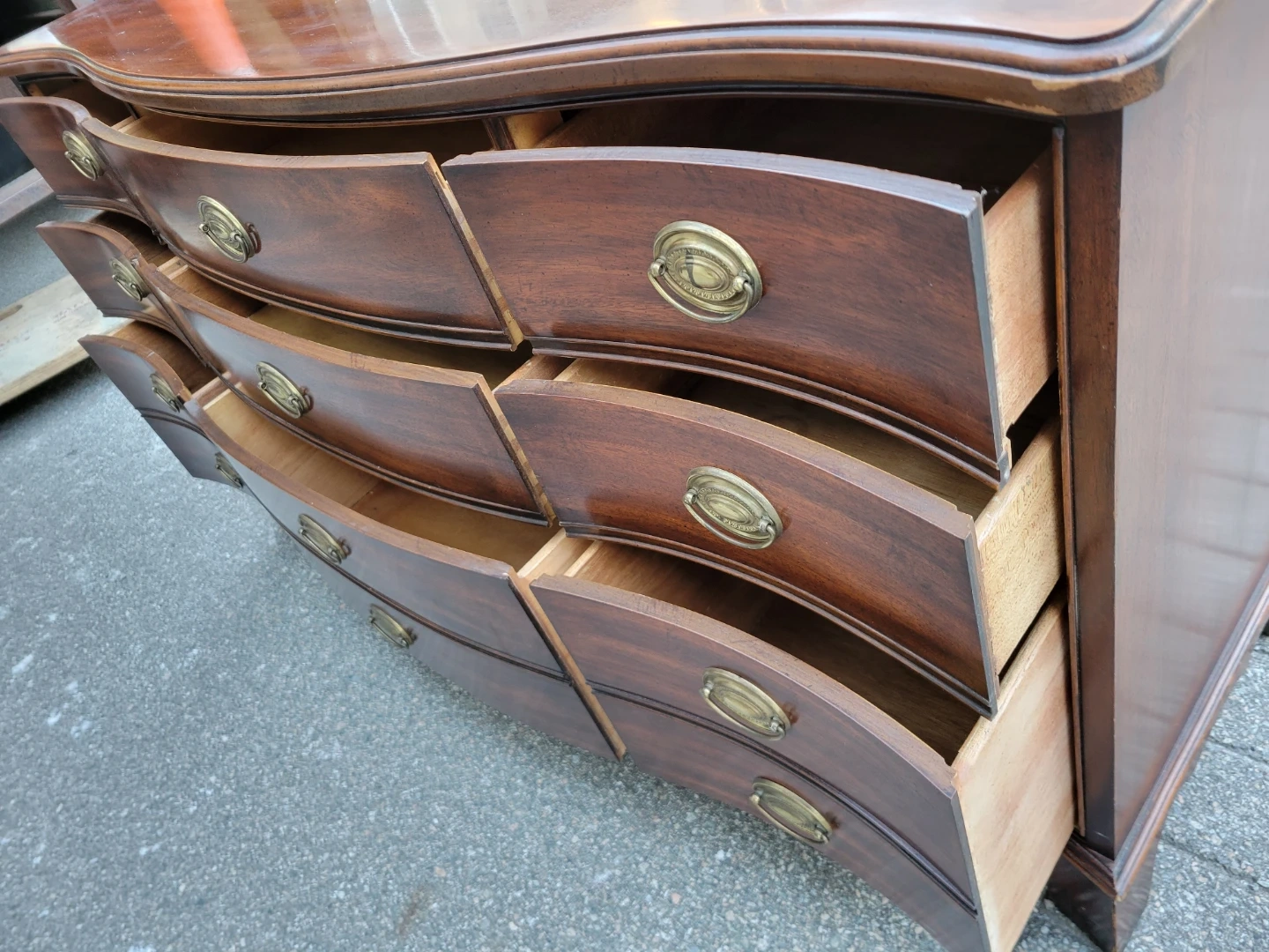 Up for sale is a stunning vintage mahogany dresser / sideboard featuring a classic serpentine (curved) front. This piece is solid, well-crafted, and offers a massive amount of storage with smooth-sliding drawers.