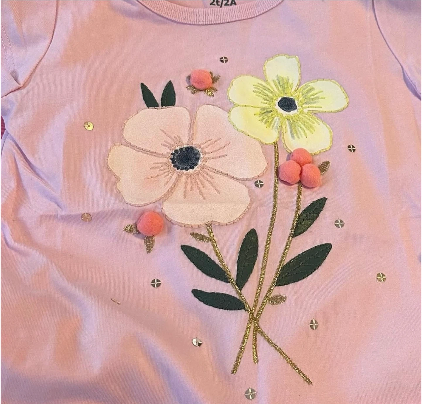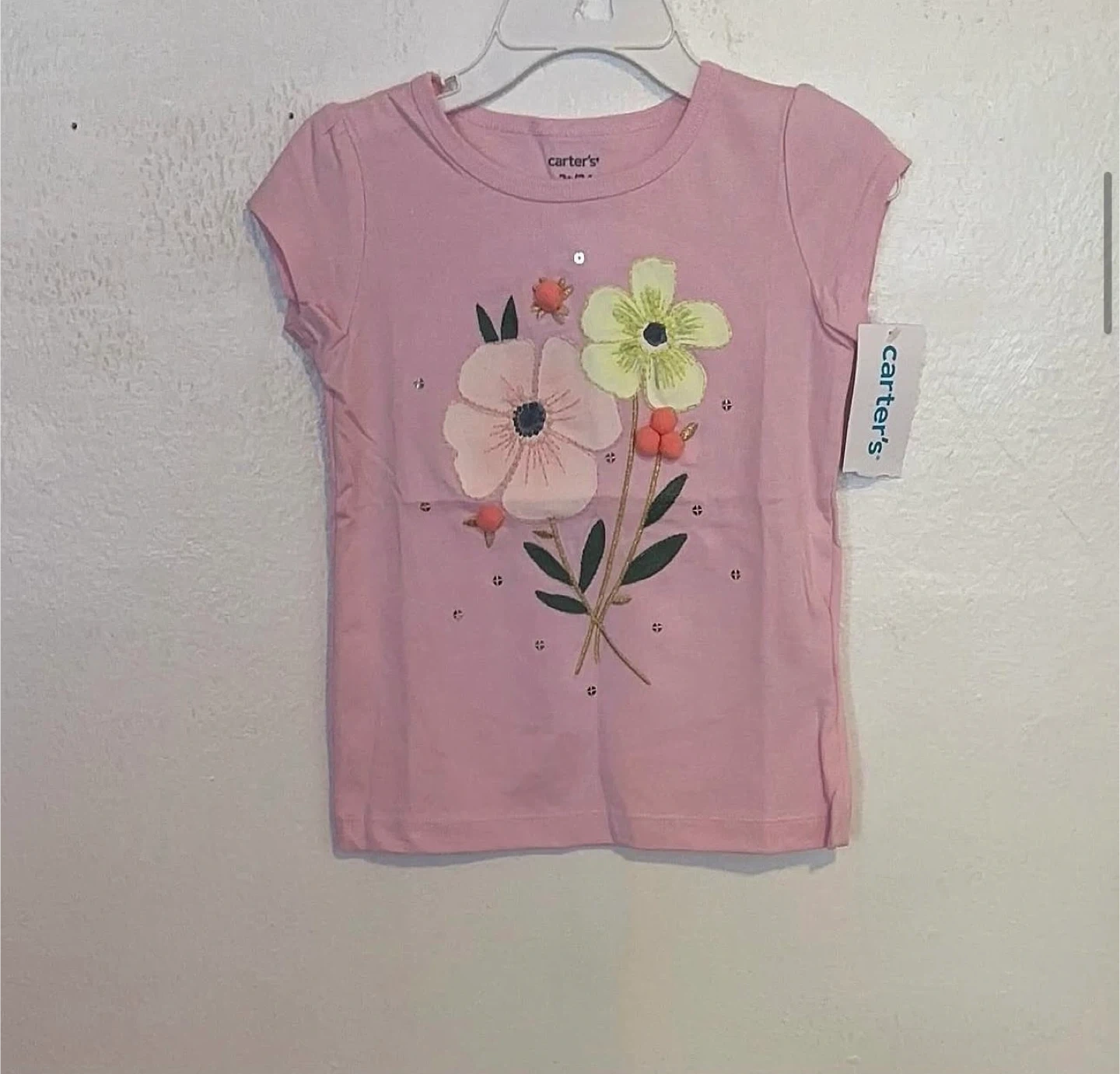 This is a Carter's pink t-shirt for toddlers. It features a colourful floral appliqué with pom-pom accents and sequins. It's made from a soft cotton blend. This shirt is perfect for everyday wear!