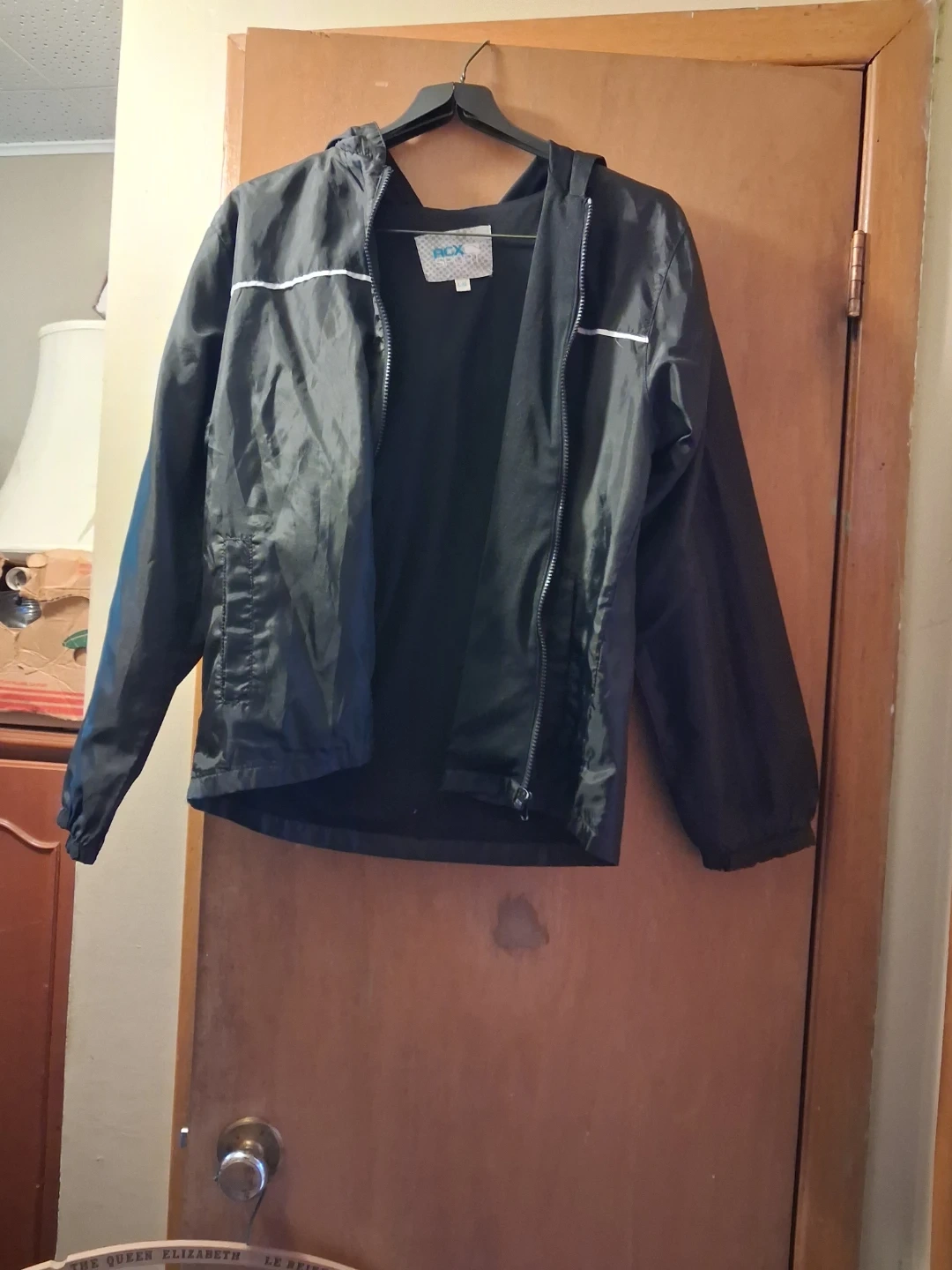 This is a black hooded windbreaker jacket from RCX. It has white stripe accents on the chest and sleeves. Made of lightweight material, it's perfect for windy days. It zips up the front and has elastic cuffs.