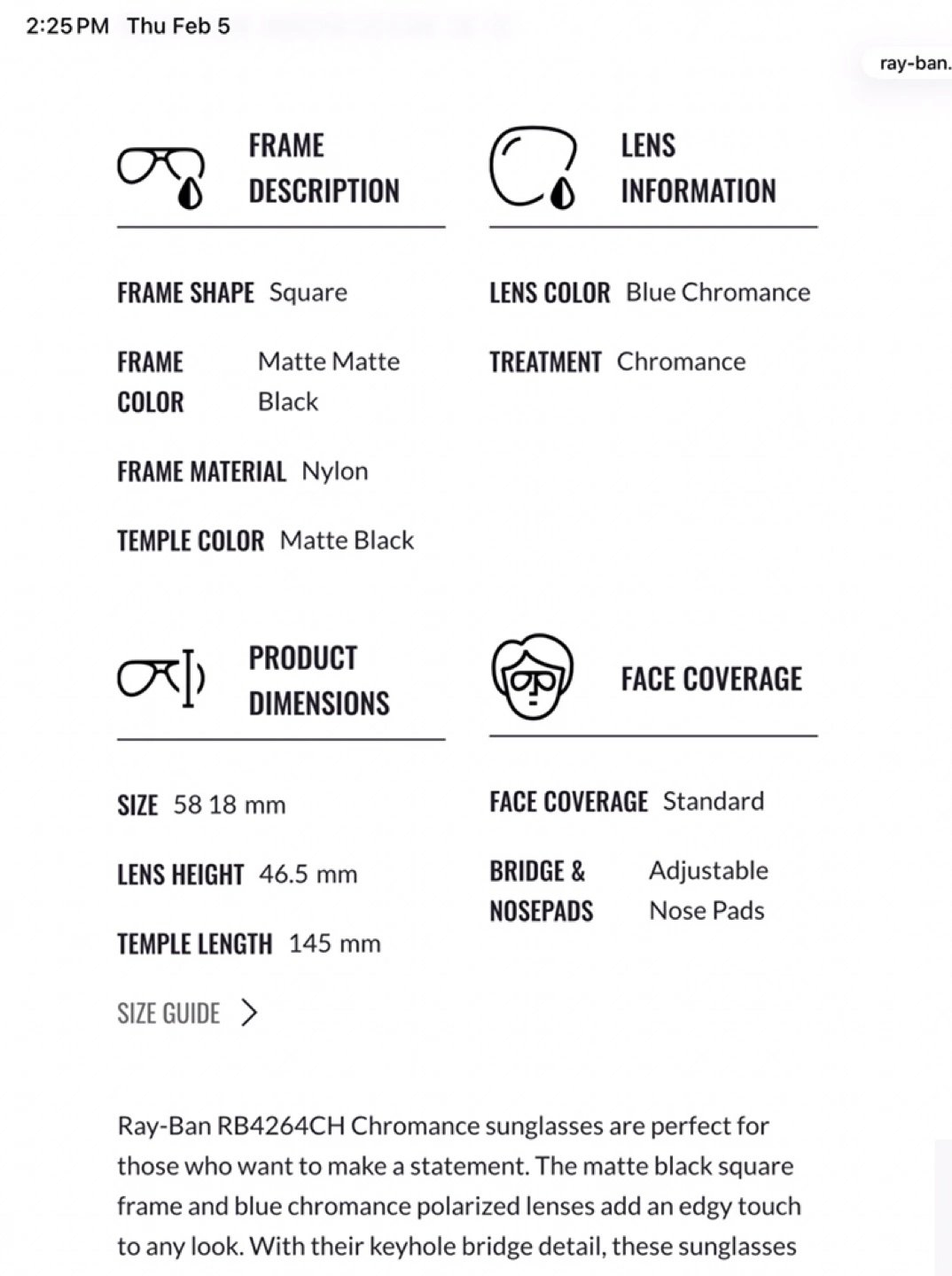 Ray-Ban RB4264 Chromance sunglasses feature a matte black square frame with blue chromance polarized lenses. Frame material is nylon and temple length is 145 mm. Includes original box, case, and cleaning cloth. These sunglasses offer standard face coverage with adjustable nose pads.