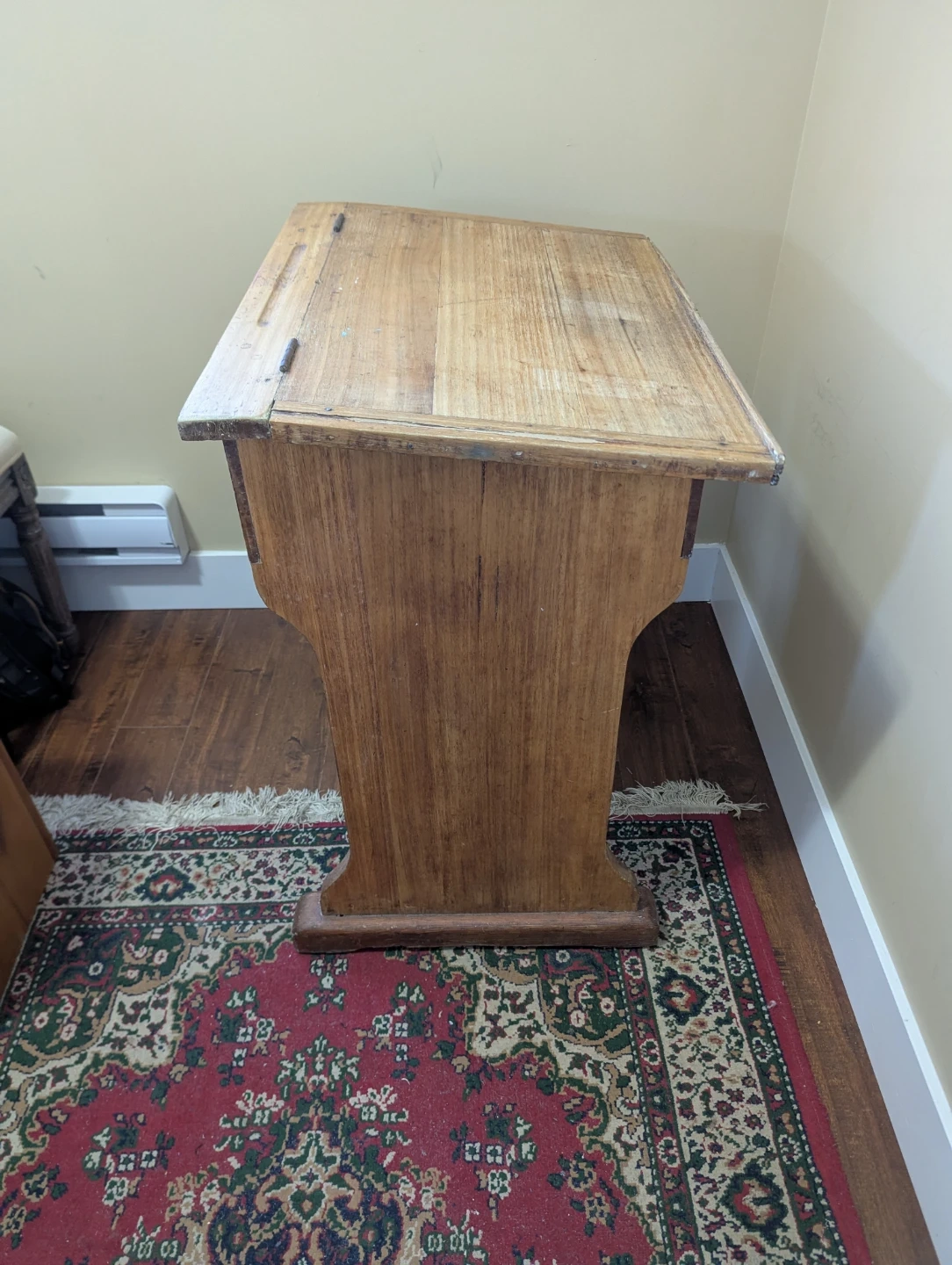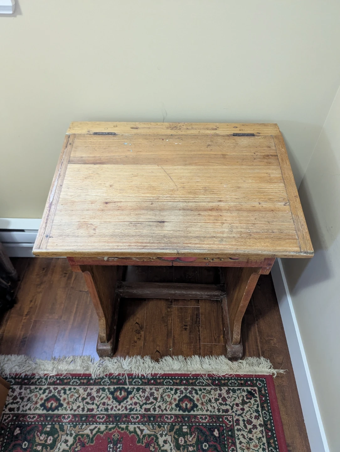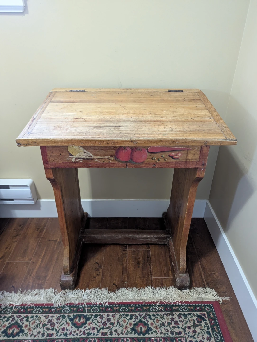 This charming vintage wooden desk features a lift-top lid and hand-painted designs of fish and vegetables on the sides. It's a unique piece with a rustic aesthetic. The desk includes a matching wooden chair.