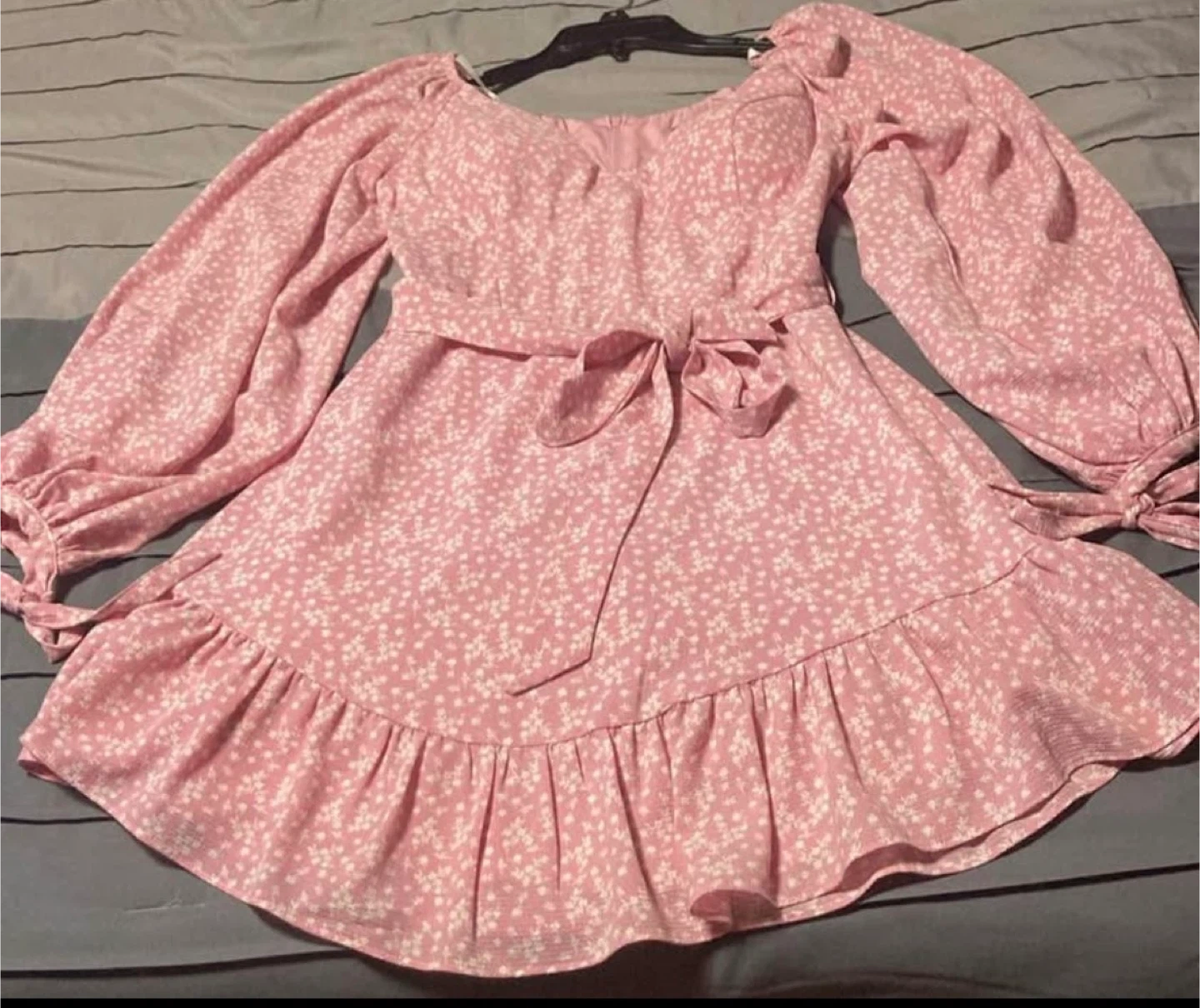 Pink floral puff sleeve mini dress for Juniors with tie waist
