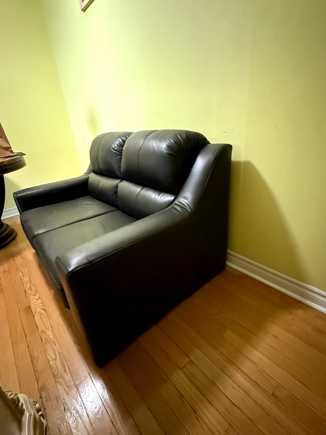 This is a brown faux leather loveseat sofa.