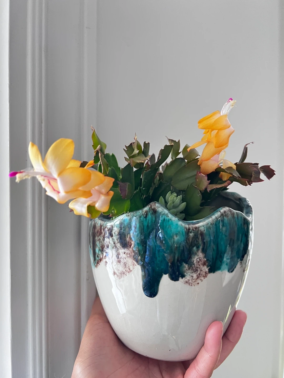 Christmas cactus plant with beautiful yellow blooms is ready for a new home. It's potted in a unique, decorative ceramic container with a glossy blue and white glaze. This plant is great for adding some colour indoors during the fall and winter months!