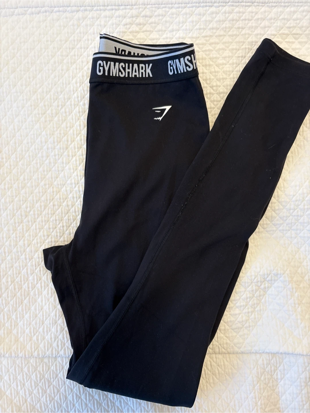 These are black Gymshark leggings. They're size small and made from 78% recycled polyester and 22% elastane. Perfect for workouts! Feel like a second skin