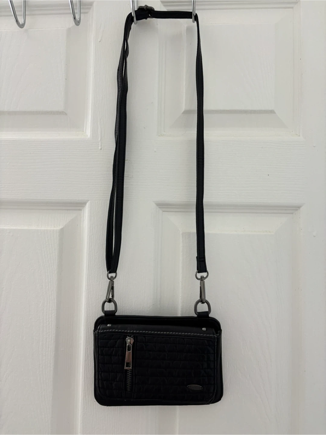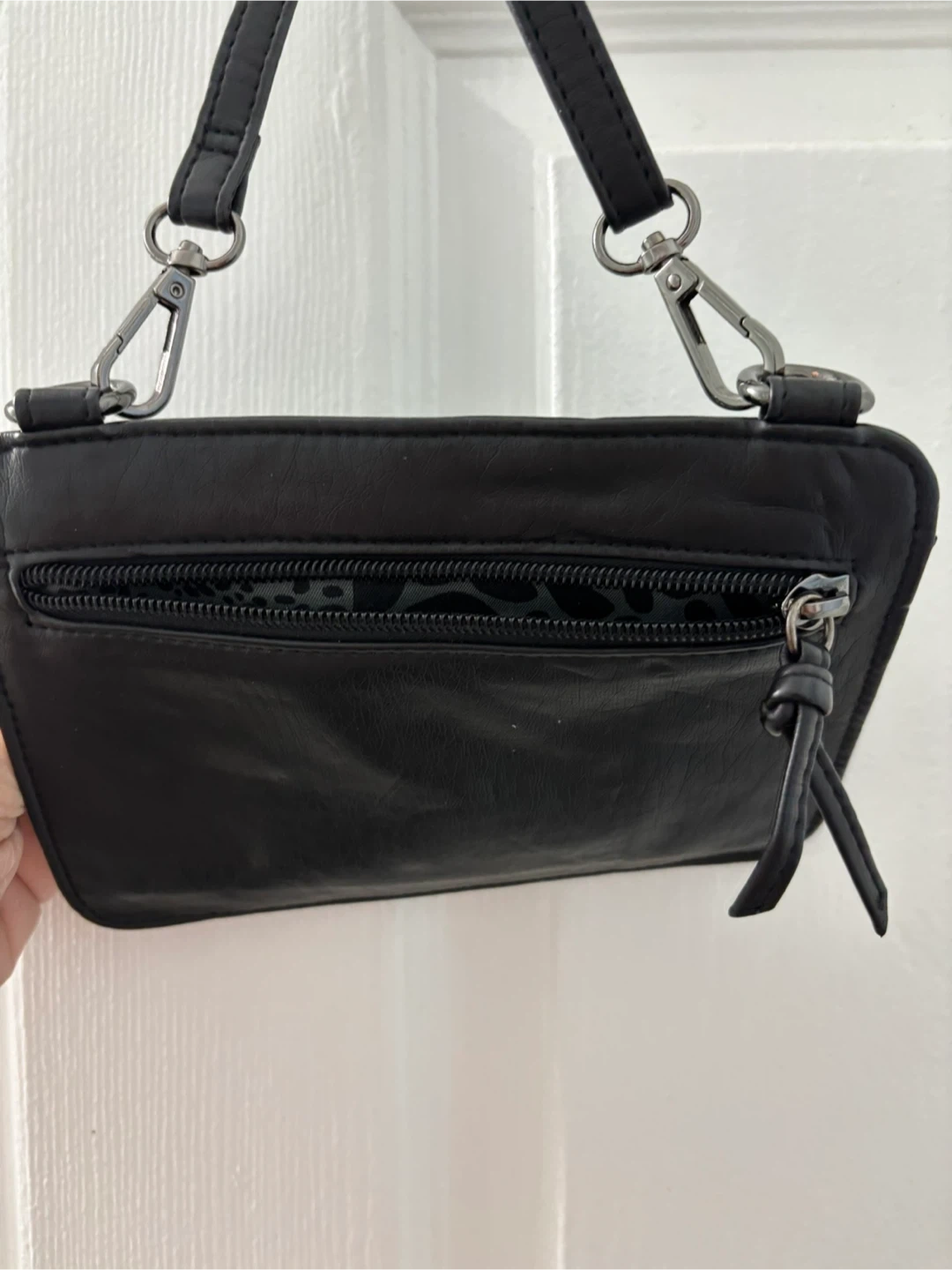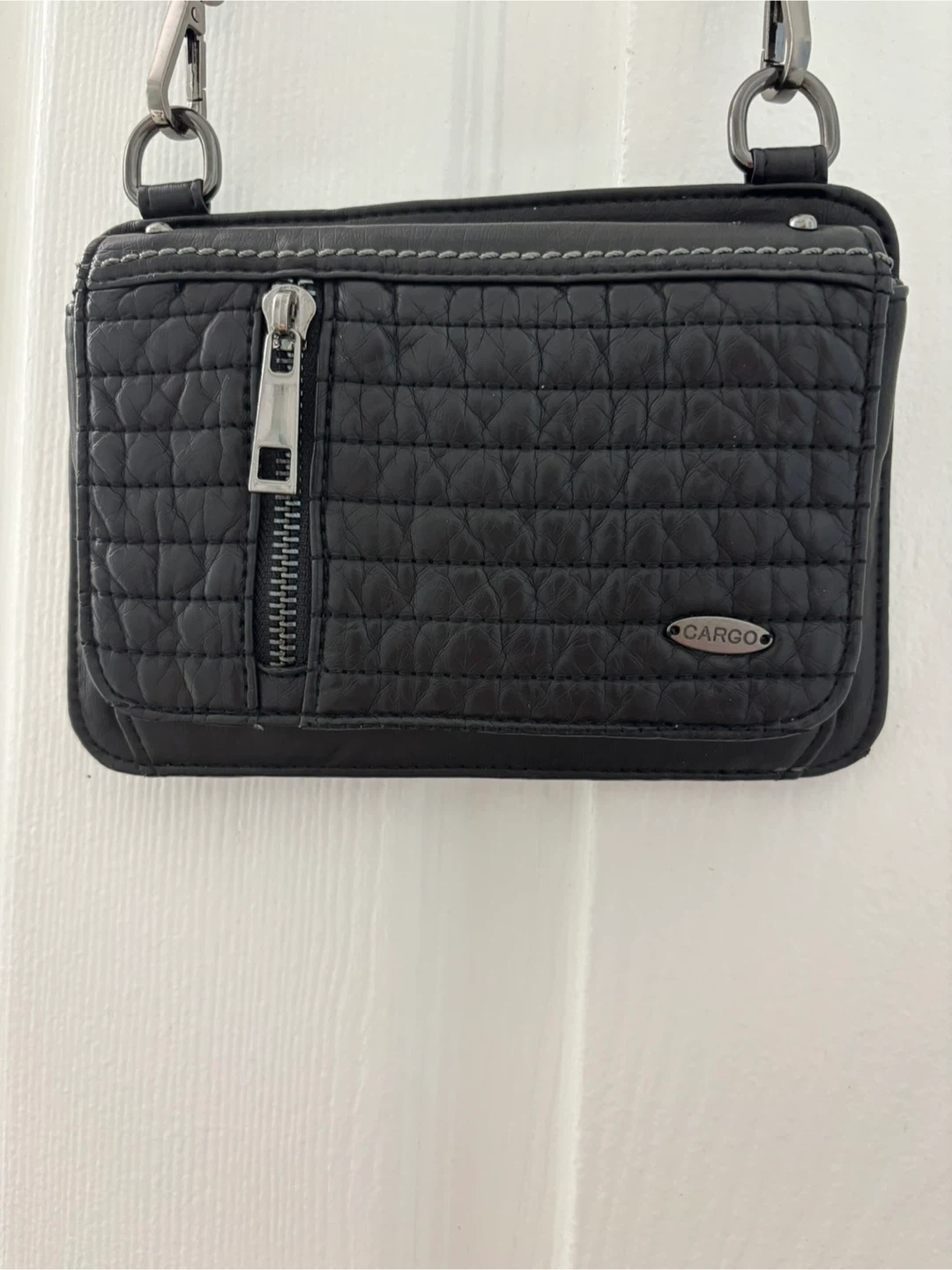 Selling a black crossbody bag from Cargo! It has a quilted design on the front and a zipper pocket. The interior has a fun leopard print lining.
