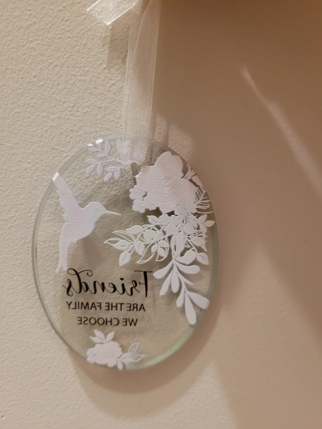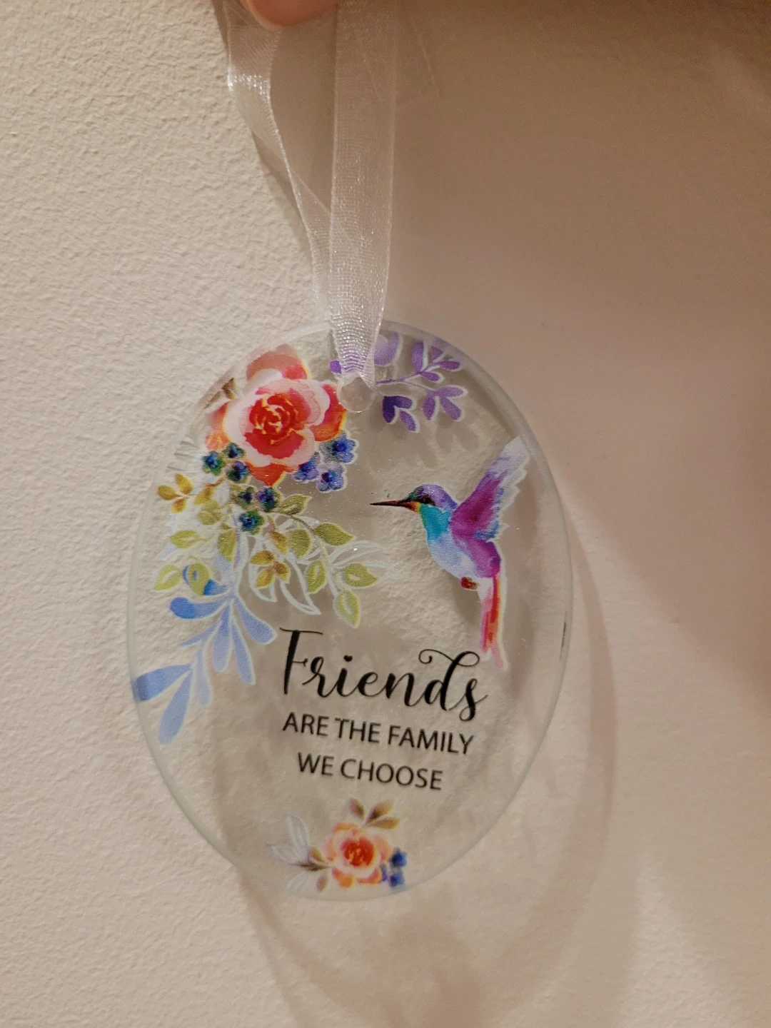 This round glass ornament features a hummingbird and floral design with the quote "Friends ARE THE FAMILY WE CHOOSE". It's a lovely way to celebrate friendships. It hangs with a sheer ribbon.