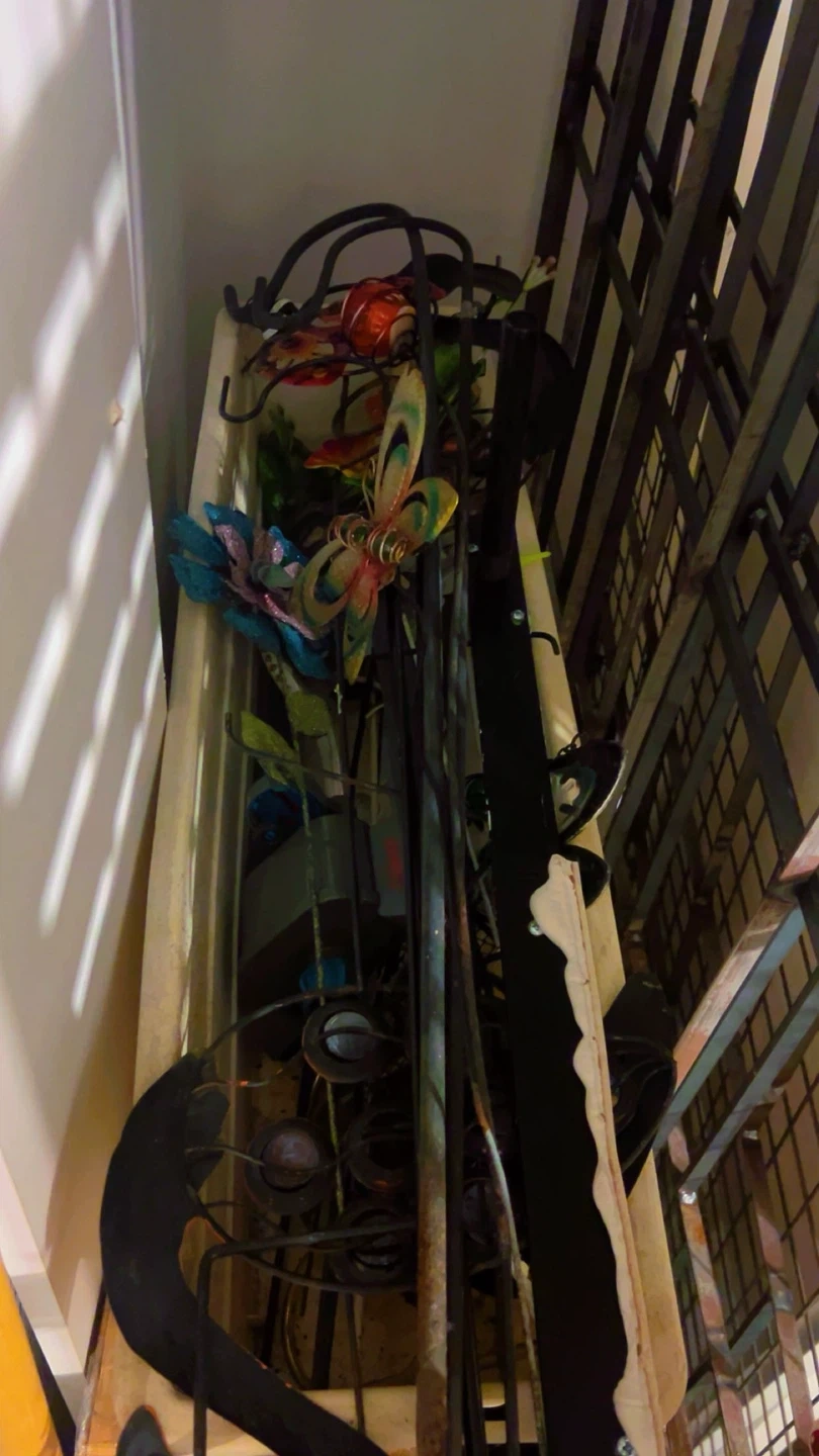 This is a metal garden sculpture featuring colourful flowers and a butterfly. It's made from durable metal and designed to add a decorative touch to outdoor spaces. The sculpture's intricate design makes it a lovely accent piece for any garden! Extra poles aswell