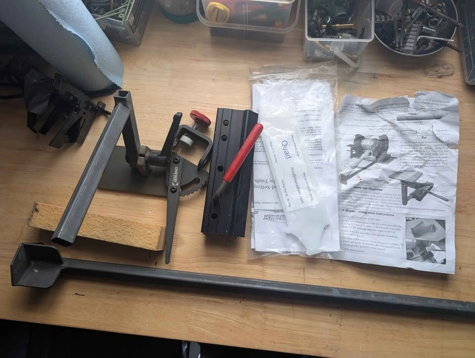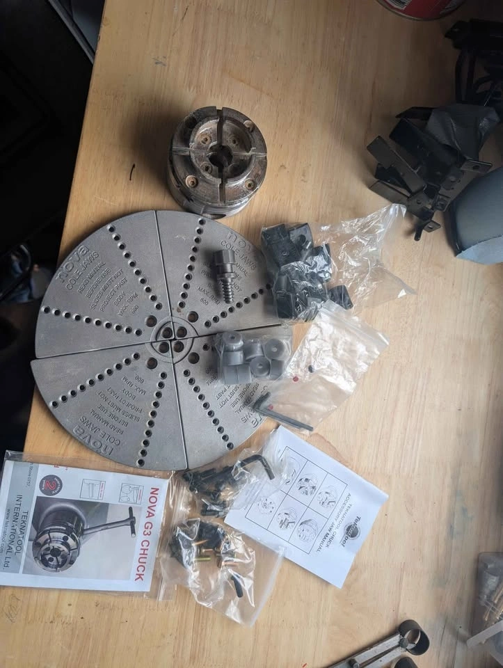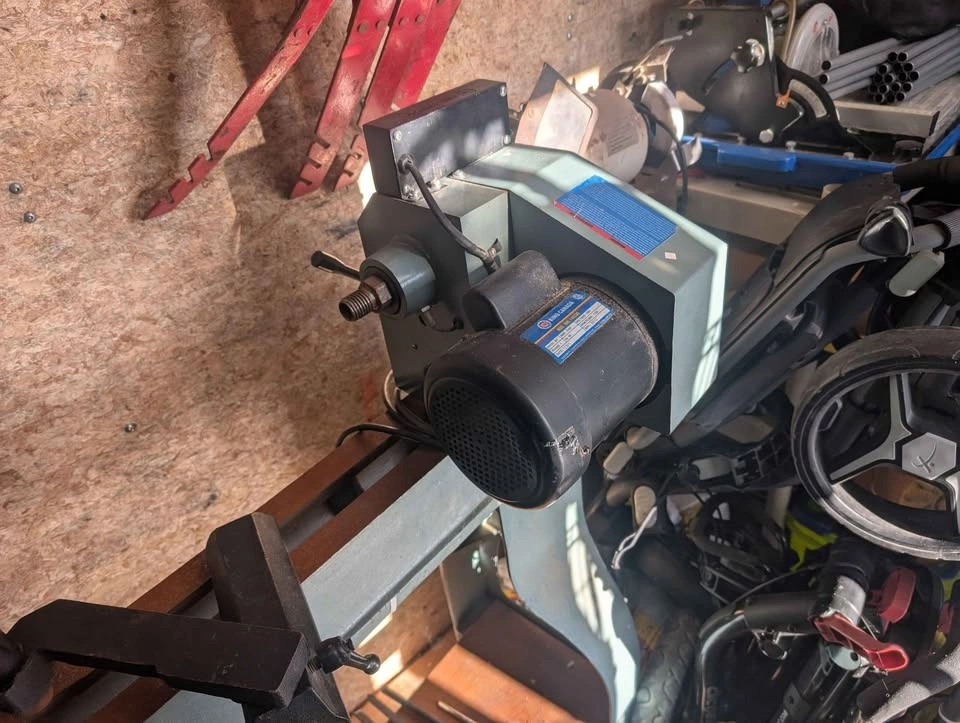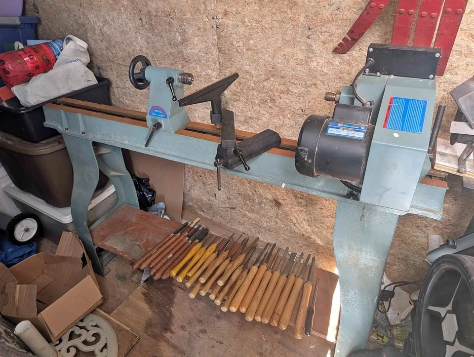 King Canada wood lathe in perfect working order. Includes headstock and tailstock, many wood turning chisels, Nova chuck and bowl chuck, drill chuck, one way chisel sharpening system, and caliper set. Everything you need to start turning bowls, vases, spindles, etc. A stand bench grinder with a specified stone wheel for sharpening is also available at an extra cost.