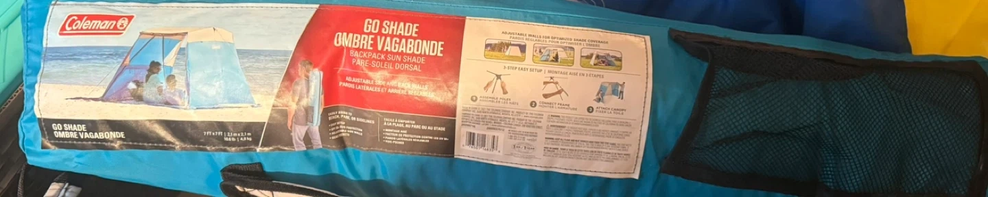This is a Coleman Go Shade backpack sun shade. It measures 7ft x 7ft and weighs 9.5lbs. It features adjustable side and back walls for optimized shade coverage and a 3-step easy setup.