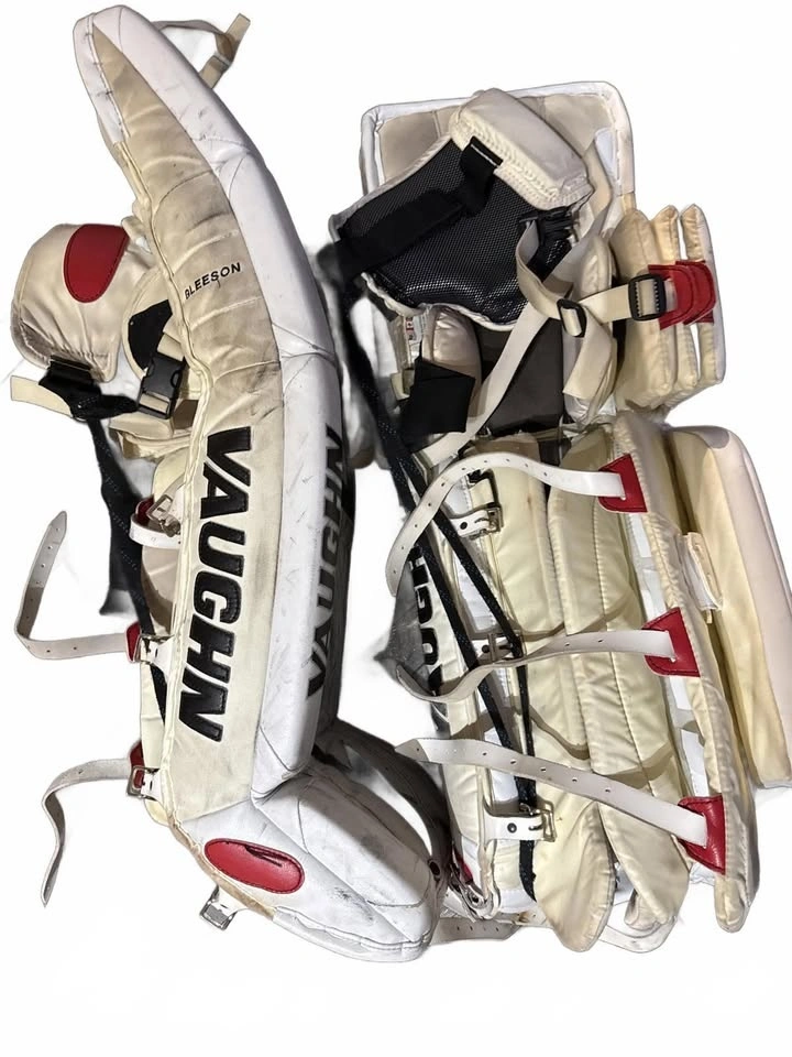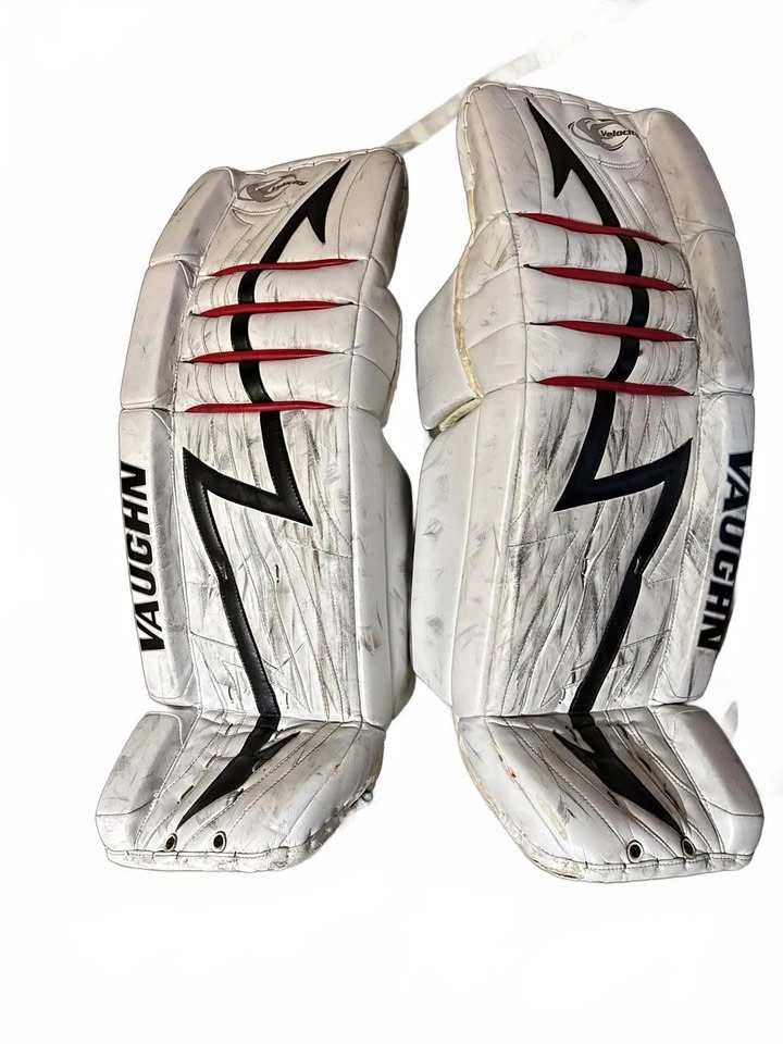 Vaughn Velocity goalie pads. These pads feature adjustable straps and padding for protection and comfort. Suitable for intermediate to advanced players. Some signs of use but overall in good condition.