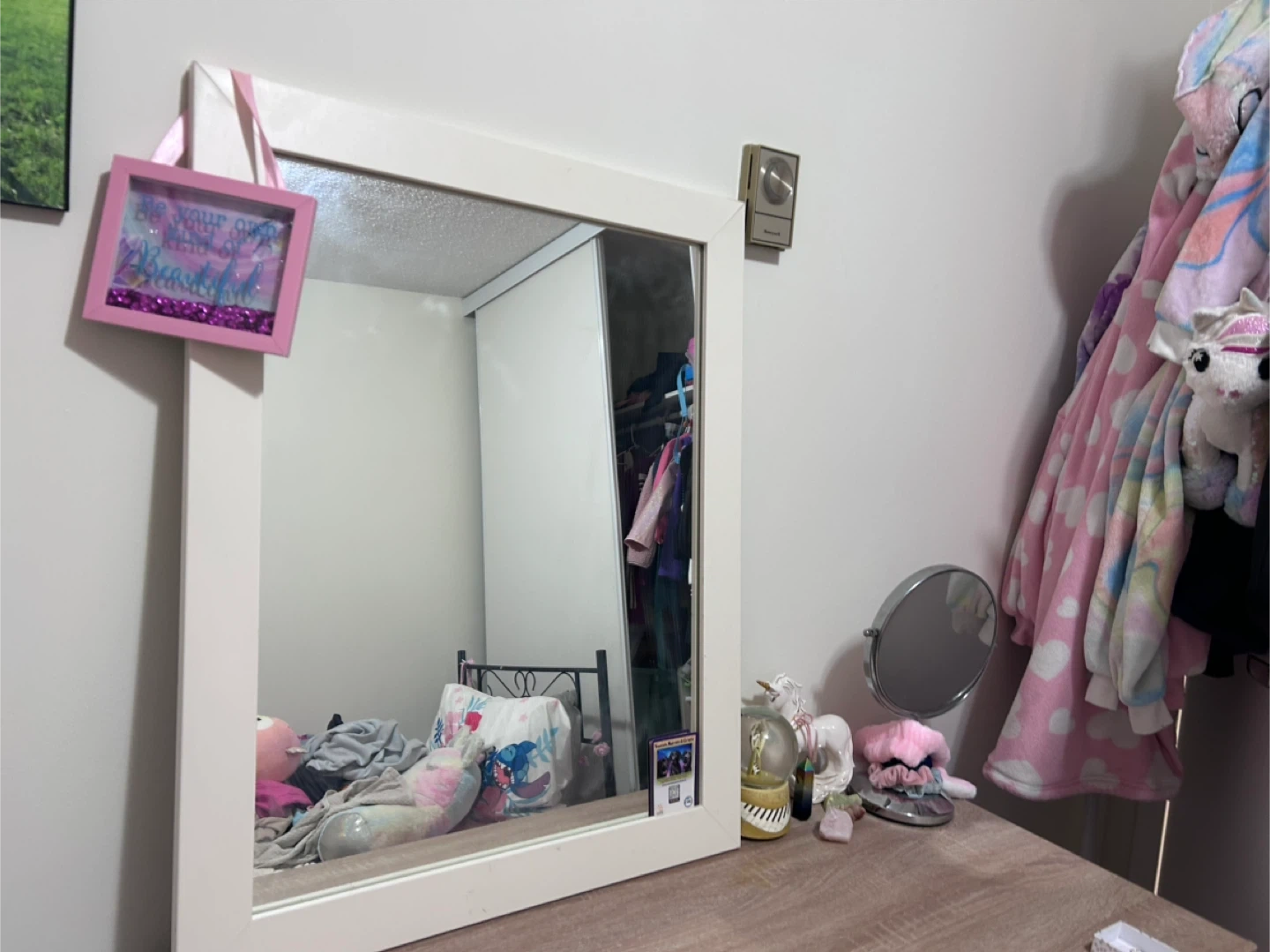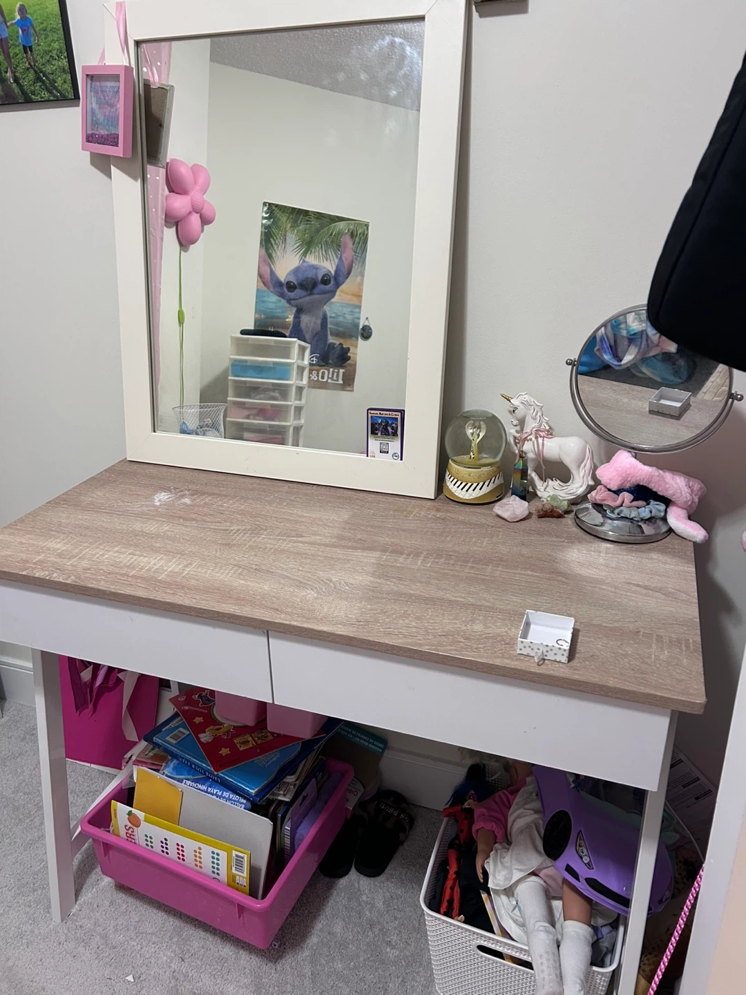 White vanity desk with a wood-look top and two drawers. It's a great spot for getting ready. This desk is perfect for a bedroom or a child's room.