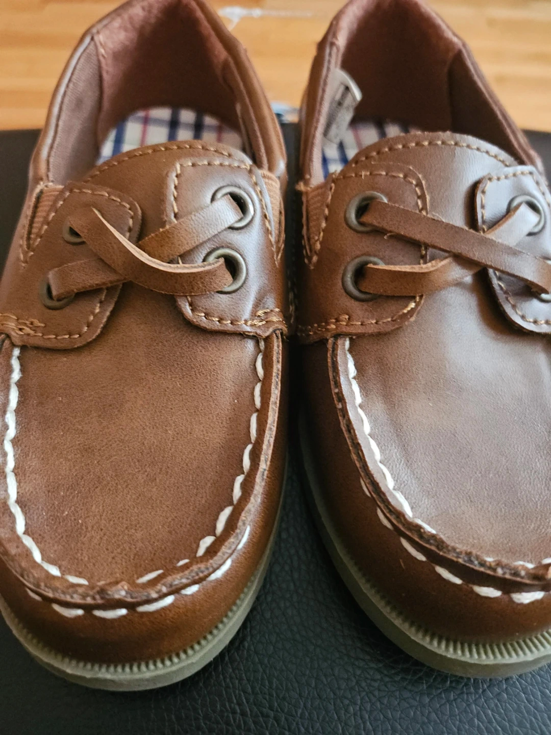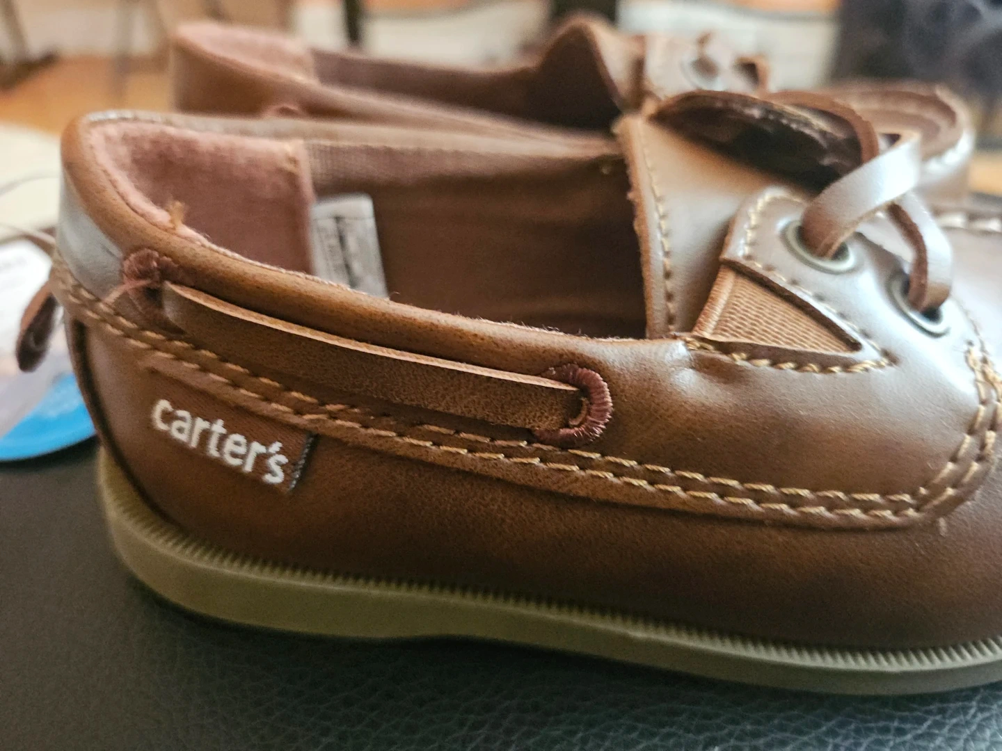 Toddler boat shoes from Carter's in a classic brown color. Features a faux-leather upper with decorative lacing and a checkered fabric lining. The soles have a grippy pattern.