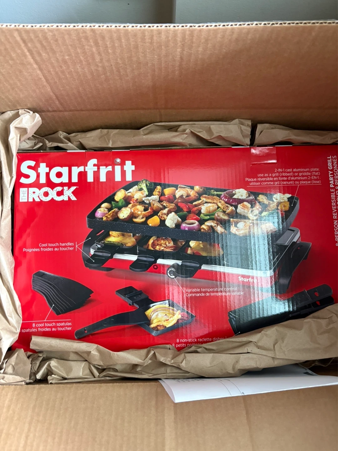 This Starfrit The Rock party grill is a 2-in-1 cast aluminum plate that can be used as a grill or griddle. It has cool touch handles and variable temperature control. It comes with 8 non-stick raclette dishes and 8 cool touch spatulas. This grill is perfect for hosting parties or family gatherings!
