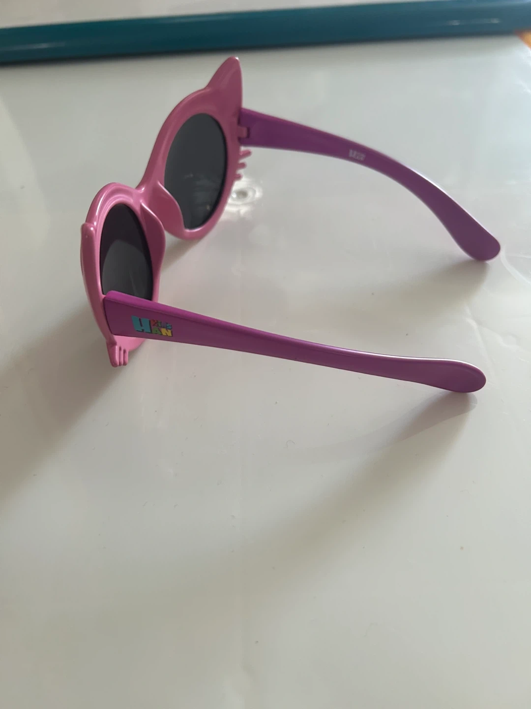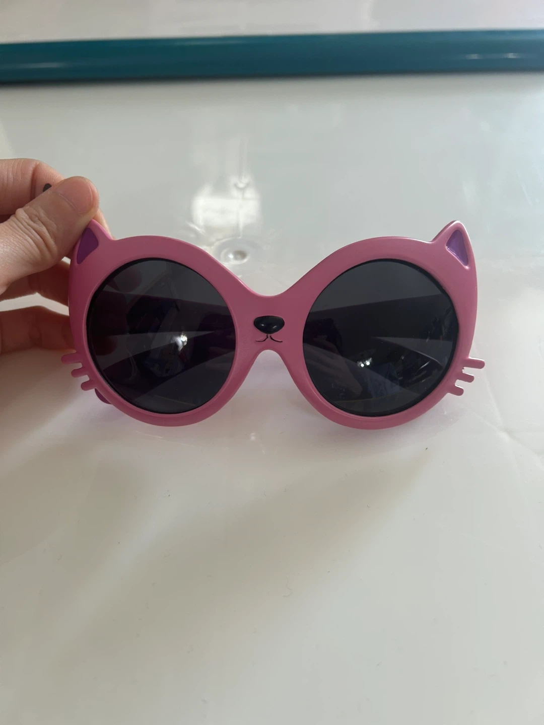 Fun pink cat-shaped sunglasses for kids. They have a playful design and offer UV protection. Great for sunny days and dressing up!