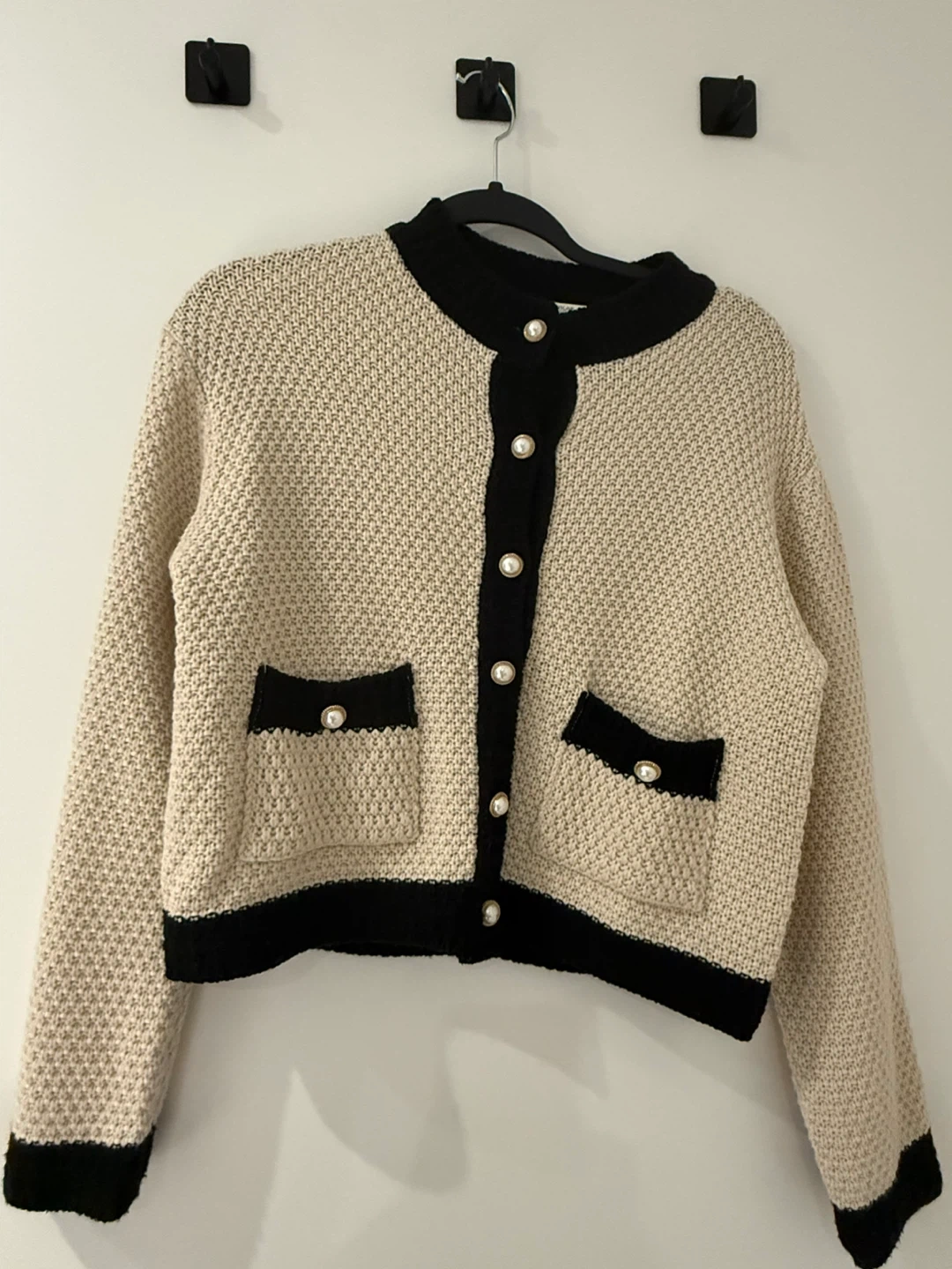 A lovely knit cardigan in beige with black trim! It has a classic, elegant look with pearl-like buttons and small pockets. Perfect for layering or wearing on its own. Wore less than 5 times.