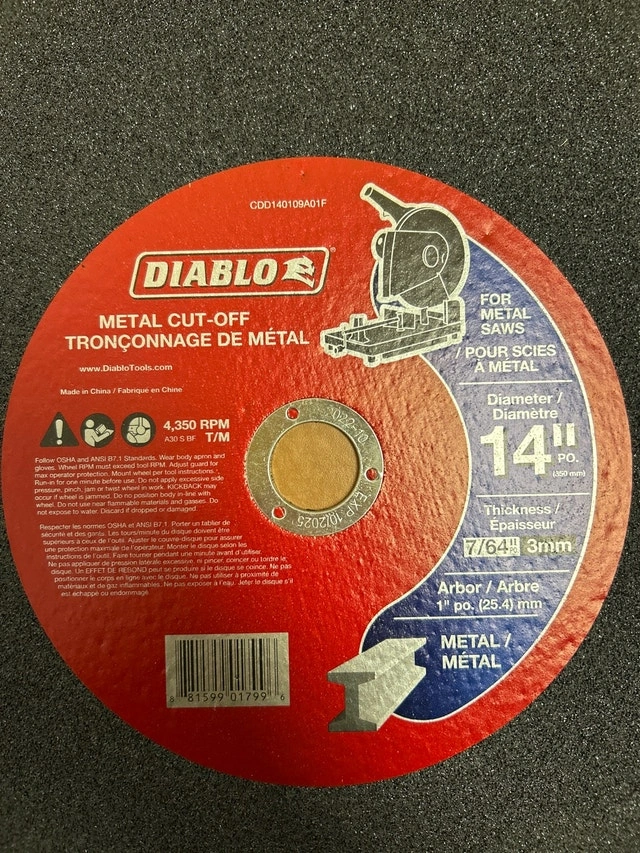 I'm offering a used Diablo metal cut-off wheel, 14 inch diameter with a 1 inch arbor. This abrasive wheel is designed for metal saws, providing efficient and clean cuts. Wheel shows signs of use but still has life left. Diameter: 14 inches. Arbor Size: 1 inch (25.4 mm). Thickness: 7/64 inch (3 mm). Max RPM: 4,350. Cash accepted.
