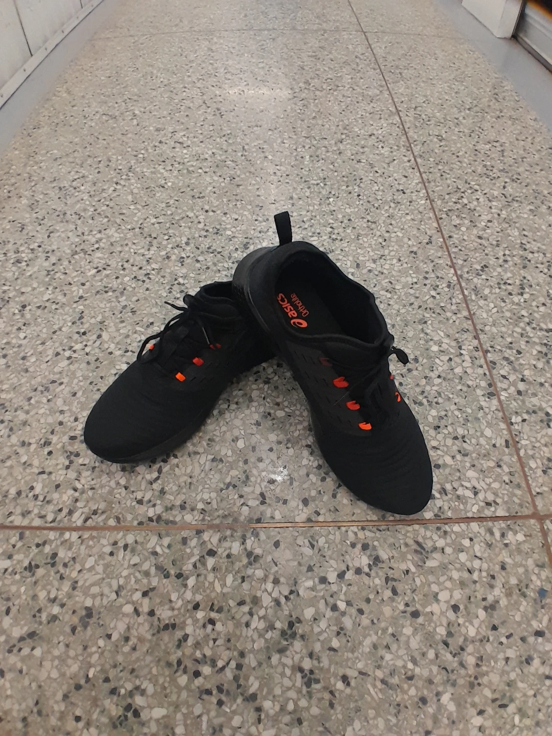 Original ASICS running shoes. They feature orange accents on the laces and eyelets. The shoes appear to be made of a breathable mesh material Men's size 14.